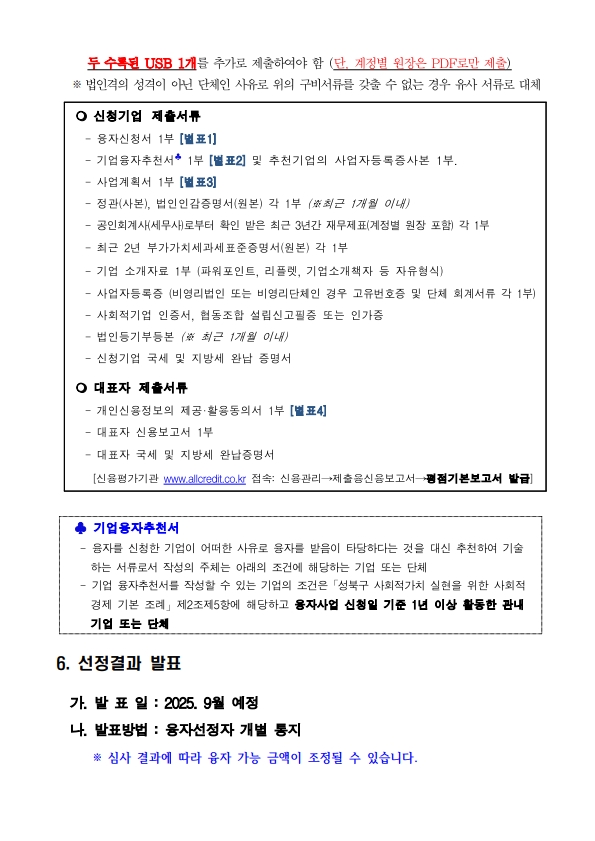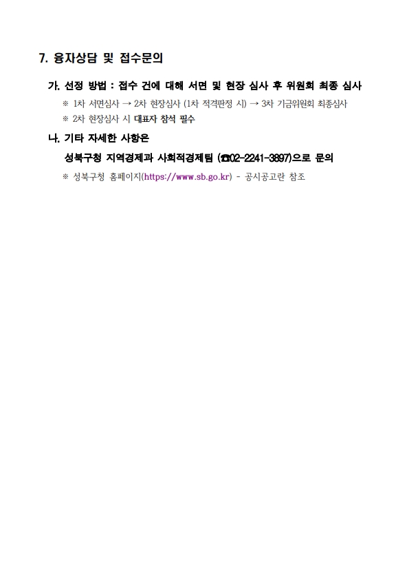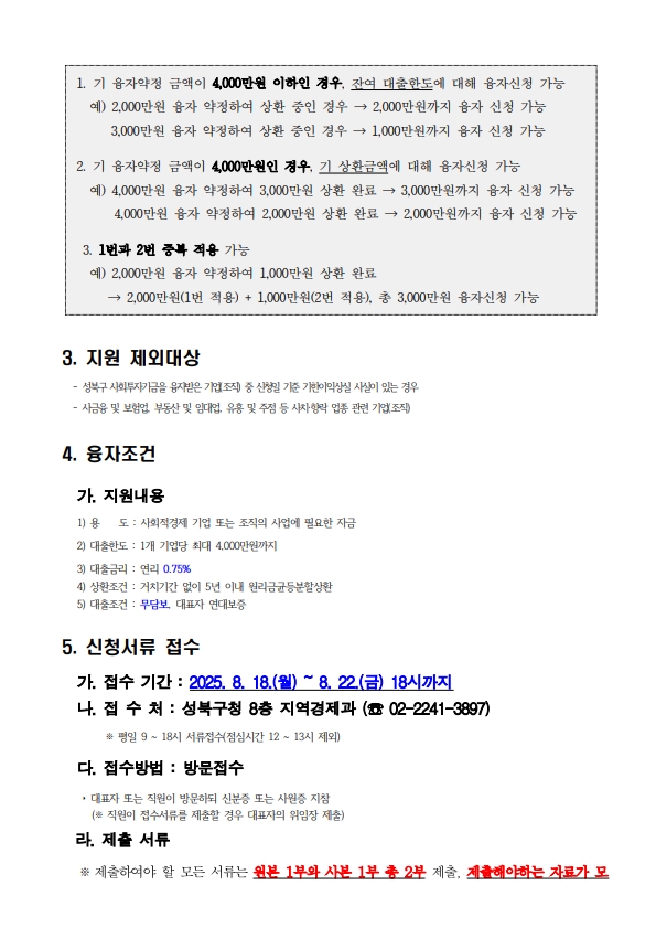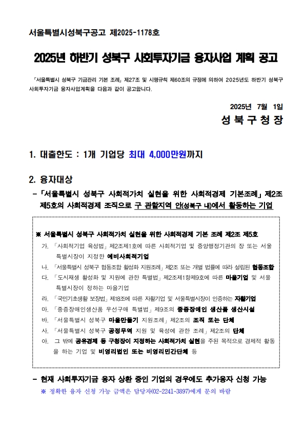 공지사항 / 외부공모·지원사업 [안내] 2025 하반기 사회투자기금 융자 사업 계획 공고(~08.22. 18:00) 사용자의 프로필 이미지 by ✨성사경✨ 2025년 7월 4일 공고 내용은 사정에 의하여 변경될 수 있습니다. 공고문과 제출서류는 첨부파일 참고 부탁드립니다. * 추천서 작성해 줄 기업을 찾기 어려우신 경우 성북구사회적경제센터(02-927-9501)로 문의주시기 바랍니다. 성북구사회적경제센터는 사회적 가치와 경제적 가치의 조화로운 추구를 통해 사회적경제 기업들이 지역사회 및 주민과 함께 성장할 수 있도록 지원합니다. 성 북 구 사 회 적 경 제 센 터 서울특별시 성북구 종암로25길 29 (종암동) 02-927-9501 sbmase3@gmail.com 공유하기 링크 공유 × 주소 복사창 첨부파일 하반기-사회투자기금-융자-공고문.pdf (351.04 KB) 하반기-사회투자기금-융자-신청서류.hwp (77.50 KB) 댓글 달기 댓글 취소댓글을 작성하시려면 로그인하셔야 합니다. 이전/다음글 이전 글 | 2025-07-02 [찾아가는 성사경 뽐뽐뽐] ③ (주)히든북 편 참여주민 모집 다음 글 | 2025-07-11 [공고] 현대백화점(미아) '로컬 상회' 운영(입점)기업 모집