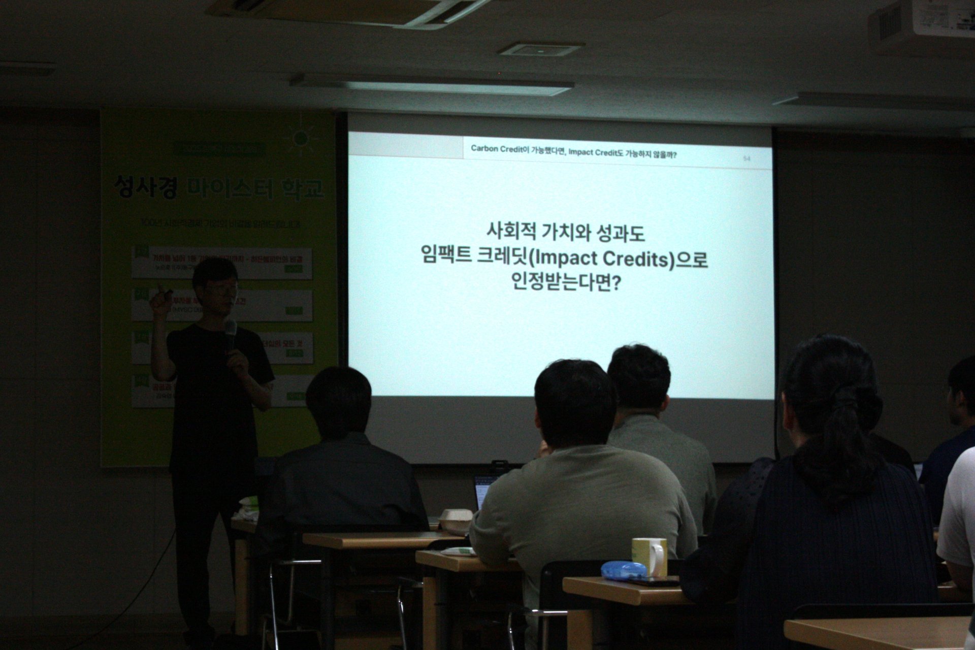 성사경 마이스터학교 두 번째 시간, 교육장은 강의가 시작하기도 전부터 기대감에 차 있었습니다. 이번 강의를 맡은 김정태 대표는 14년째 MYSC를 이끌고 있는데요. MYSC는 매년 50개 이상의 기업에 투자하는 아시아 최대 규모의 임팩트 투자사 중 하나입니다. 어떤 기업이 임팩트 투자를 받을까? 임팩트 투자를 받으려면 어떤 조건이 필요할까? 강의 주제만 들어도 호기심이 들었는데요~ 현장에서 뛰는 사회적경제 기업인들에게는 더 와닿는 주제이지 않았을까요?