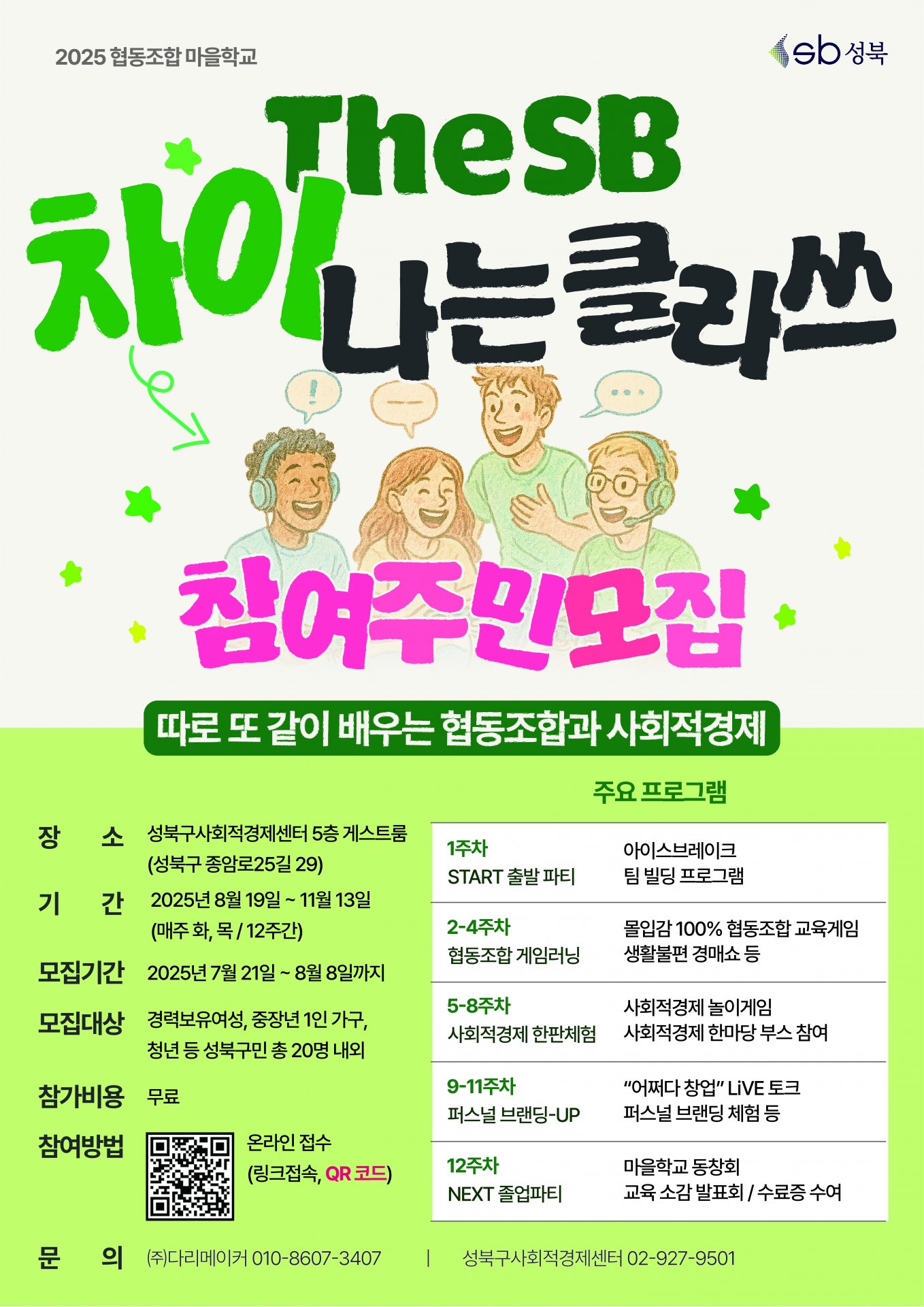 [2025 협동조합 마을학교] ‘The SB 차이나는 클라쓰’ 참여주민 모집|성북구사회적경제센터