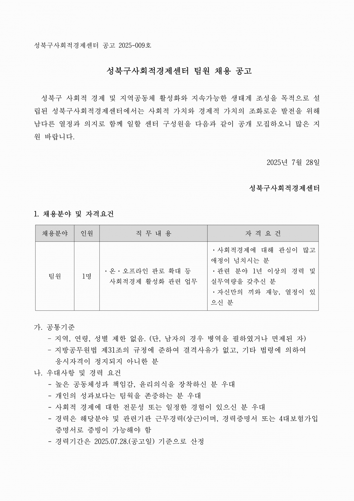 [공고] 성북구사회적경제센터 팀원 채용 공고
