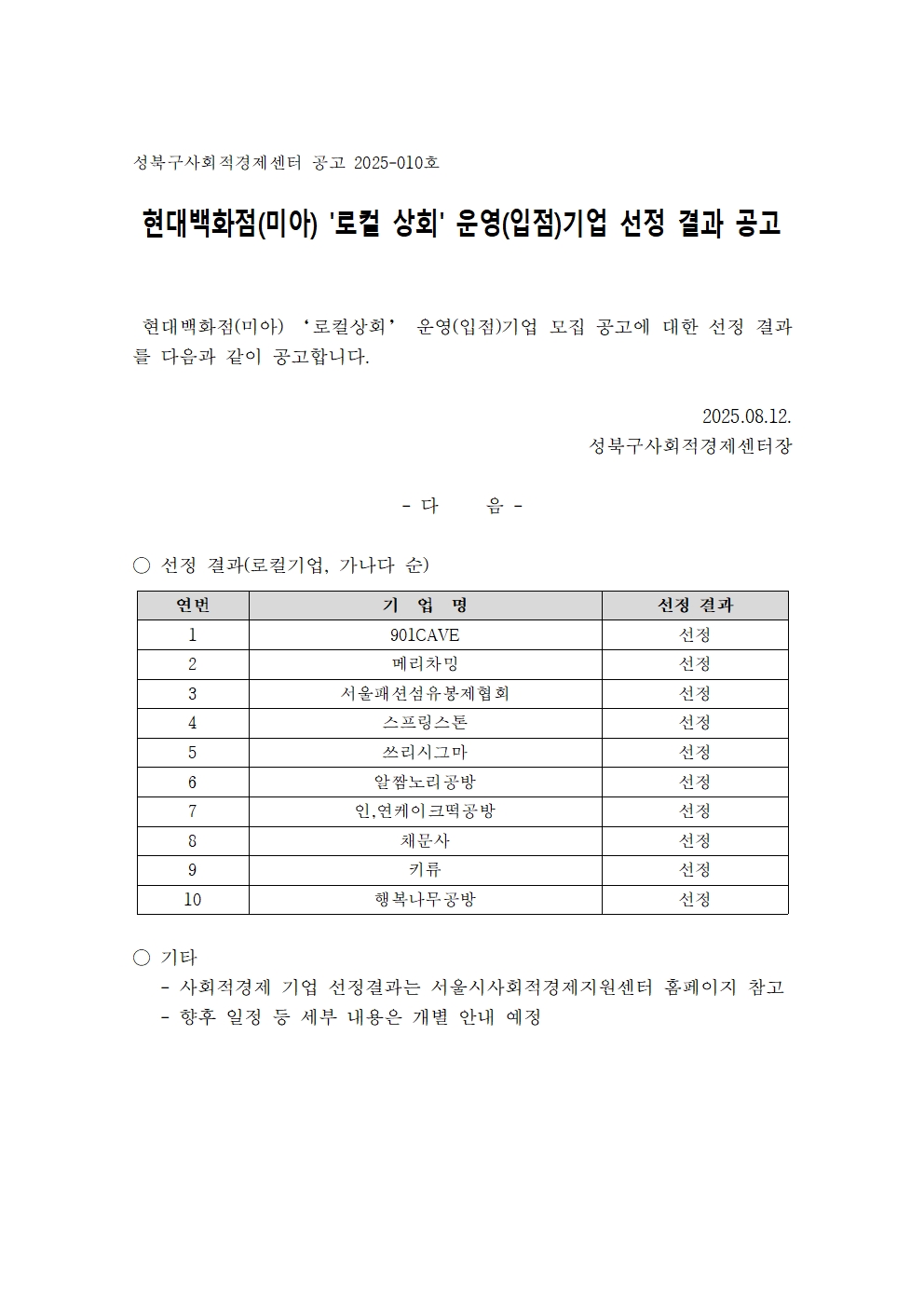 [공고] 현대백화점(미아) ‘로컬 상회’ 운영(입점)기업 선정 결과 공고