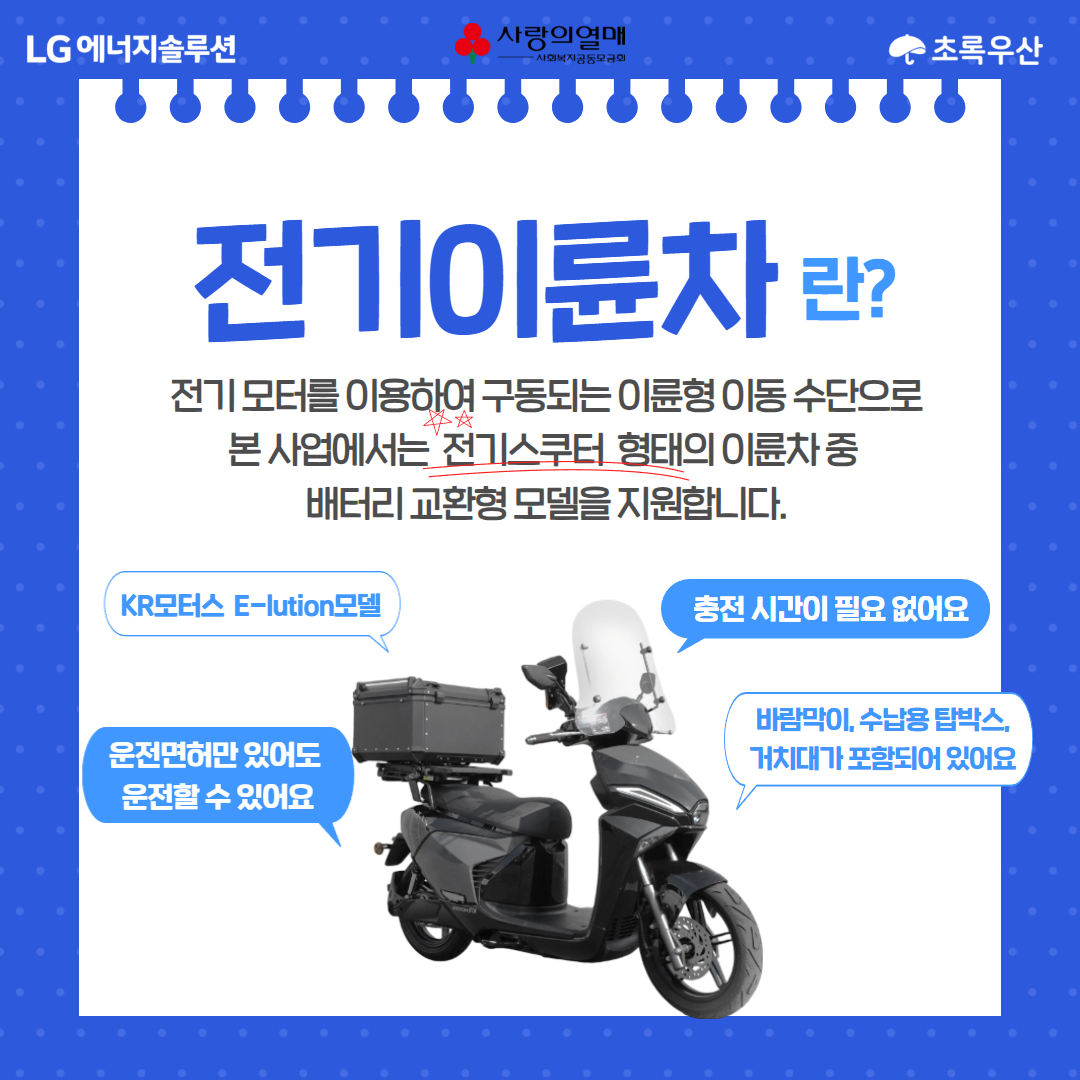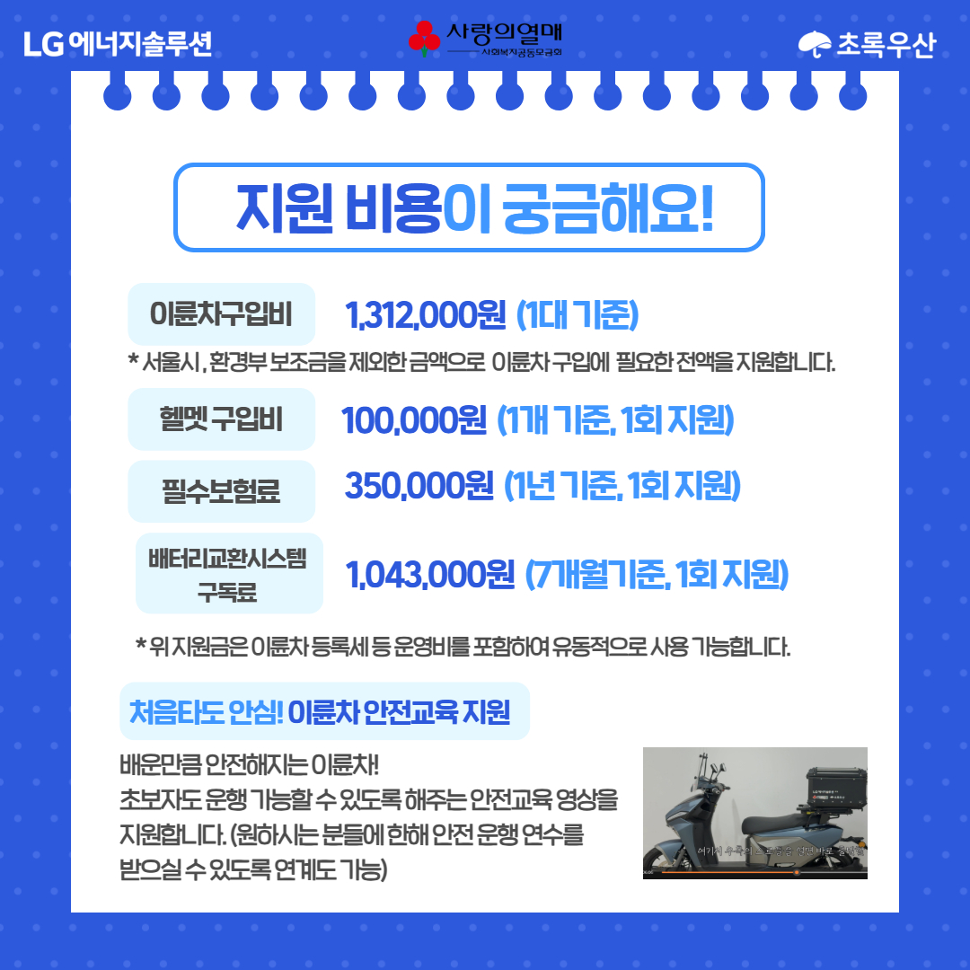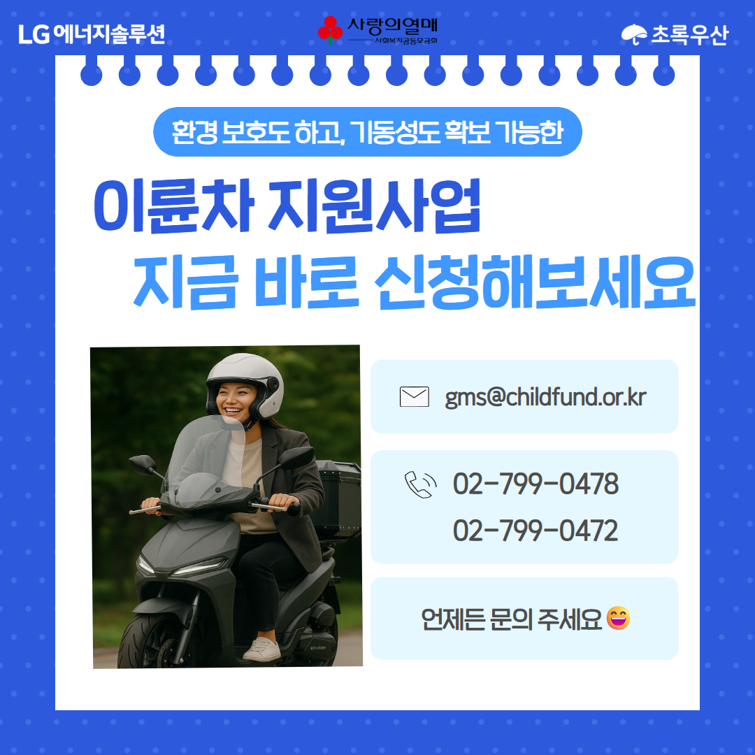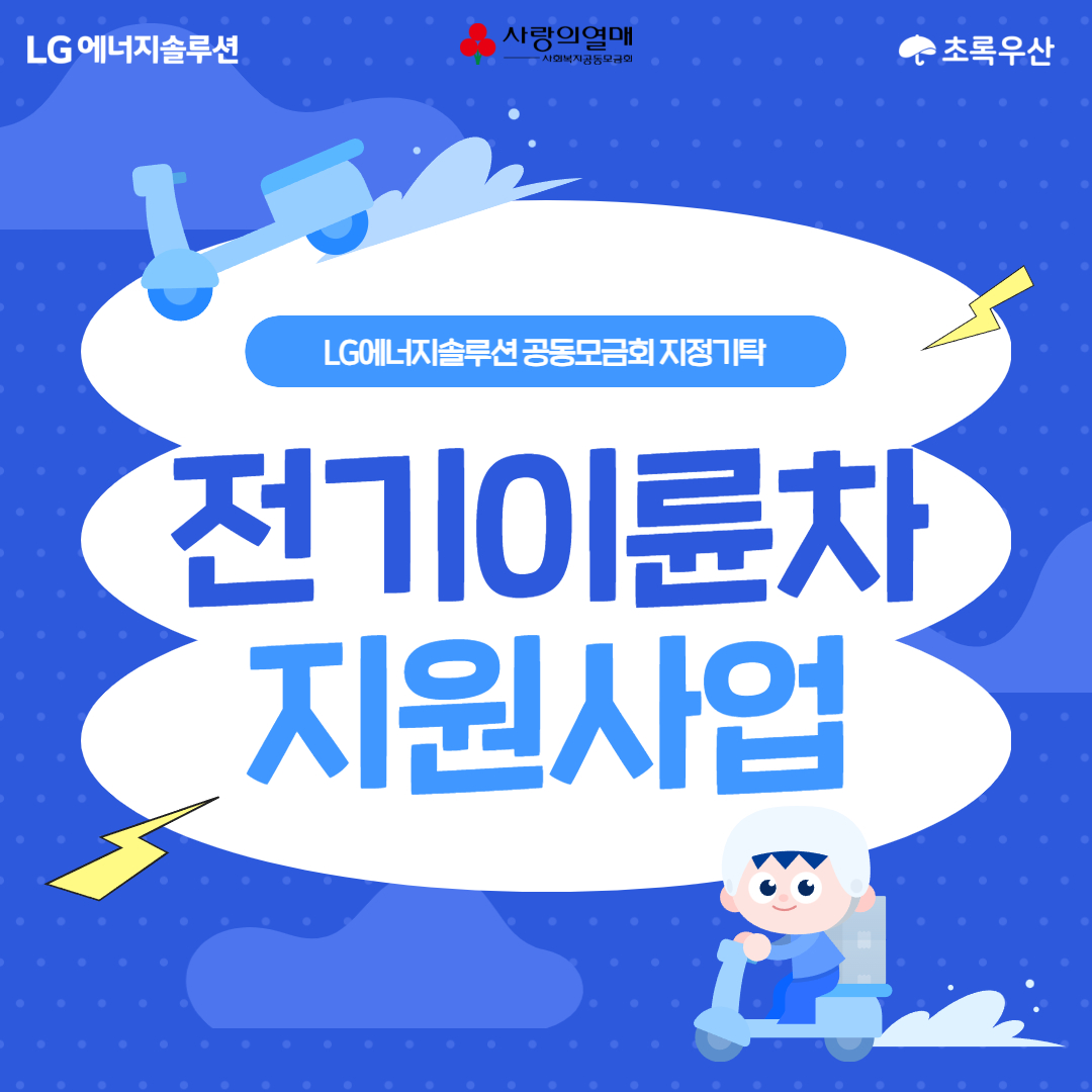 외부공모·지원사업 [안내] LG에너지솔루션 사회복지공동모금회 지정기탁 전기이륜차 지원사업 ‘그린모빌리티 솔루션 추가 모집 사용자의 프로필 이미지 by ✨성사경✨ 2025년 8월 14일 공유하기 링크 공유 × 주소 복사창 첨부파일 붙임1.-추가모집차량지원사업_사업안내문.pdf (135.31 KB) 붙임2.-추가모집LG에너지솔루션-이륜차지원사업_신청양식.zip (242.36 KB) 댓글 달기 댓글 취소댓글을 작성하시려면 로그인하셔야 합니다. 이전/다음글 이전 글 | 2025-08-07 [이달의 지원사업] 8월 2주차 사회적경제 지원사업 PICK 다음 글 | 2025-09-03 [안내] 2025년 협동조합연합회 설립 지원 프로그램 및 교육