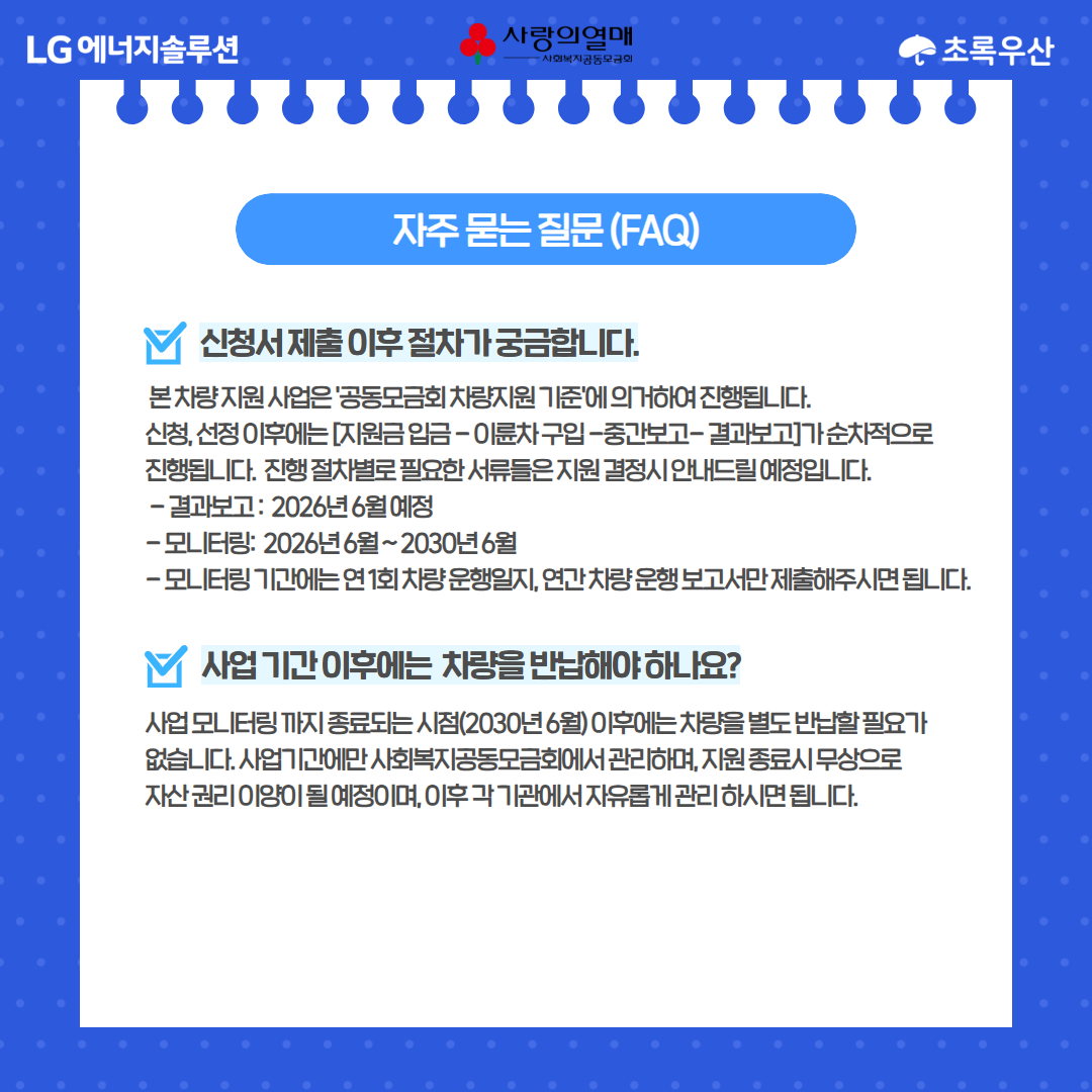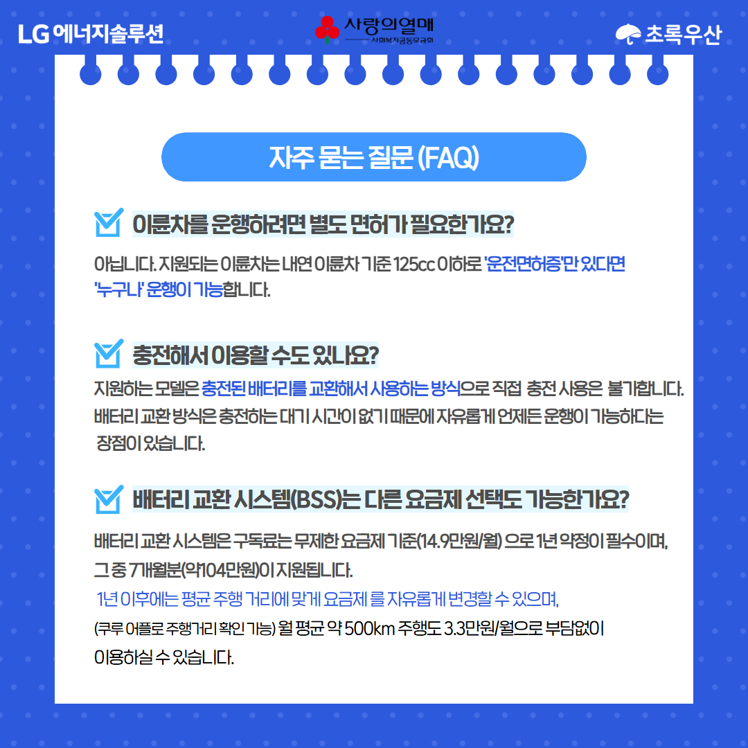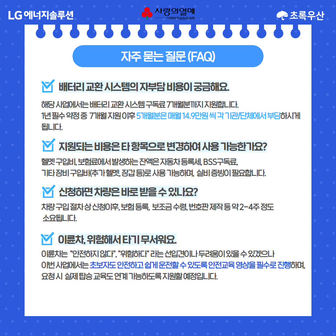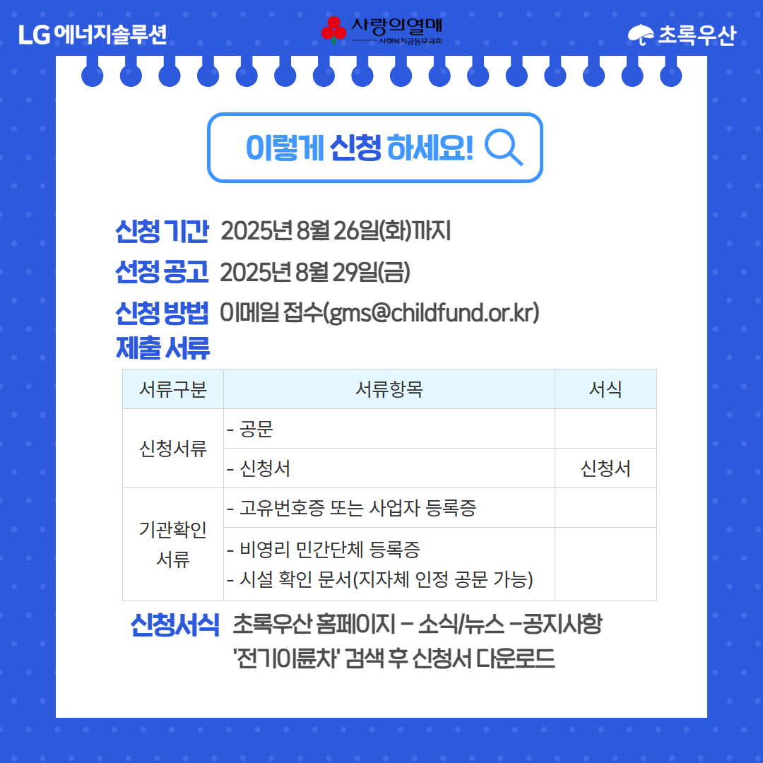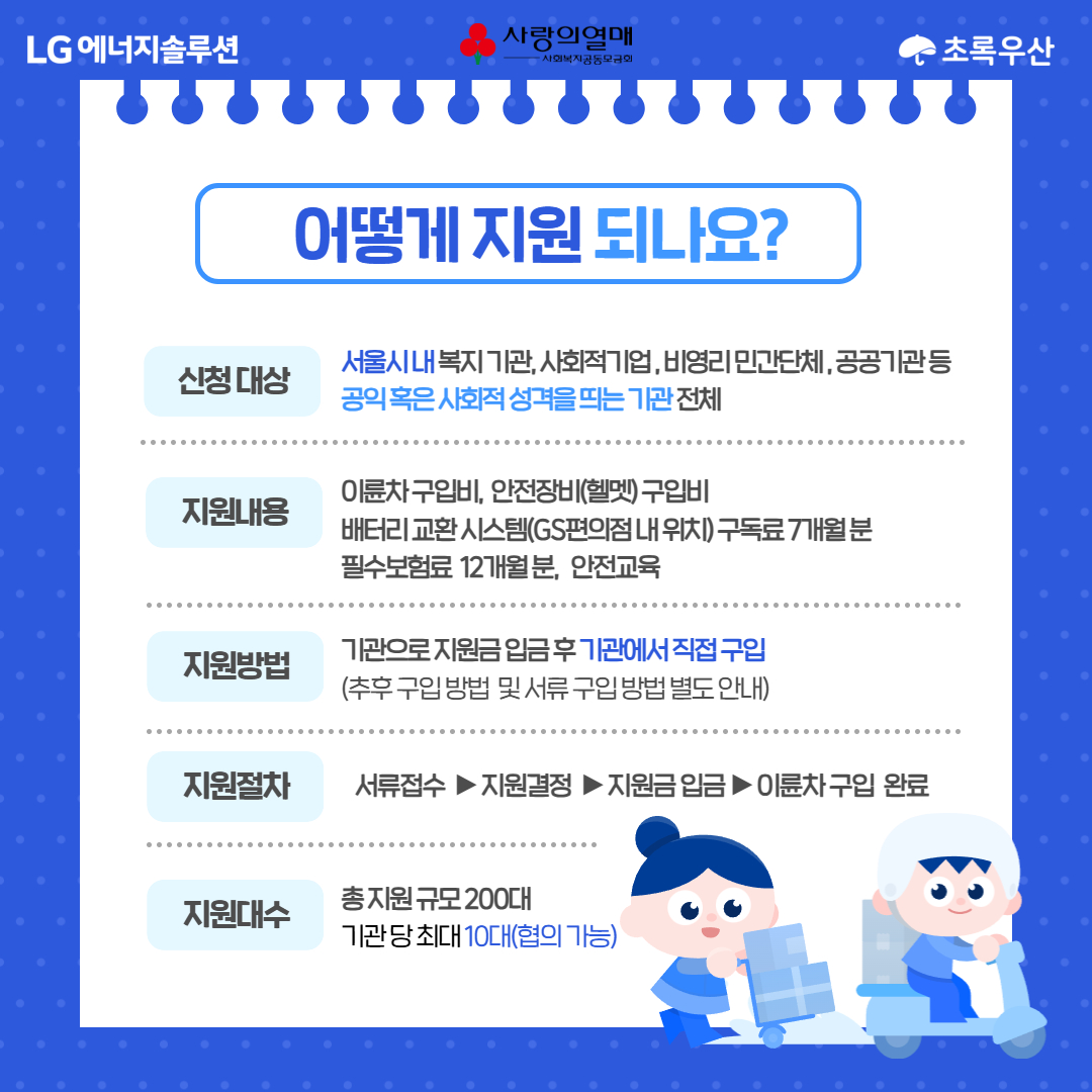 외부공모·지원사업 [안내] LG에너지솔루션 사회복지공동모금회 지정기탁 전기이륜차 지원사업 ‘그린모빌리티 솔루션 추가 모집 사용자의 프로필 이미지 by ✨성사경✨ 2025년 8월 14일 공유하기 링크 공유 × 주소 복사창 첨부파일 붙임1.-추가모집차량지원사업_사업안내문.pdf (135.31 KB) 붙임2.-추가모집LG에너지솔루션-이륜차지원사업_신청양식.zip (242.36 KB) 댓글 달기 댓글 취소댓글을 작성하시려면 로그인하셔야 합니다. 이전/다음글 이전 글 | 2025-08-07 [이달의 지원사업] 8월 2주차 사회적경제 지원사업 PICK 다음 글 | 2025-09-03 [안내] 2025년 협동조합연합회 설립 지원 프로그램 및 교육