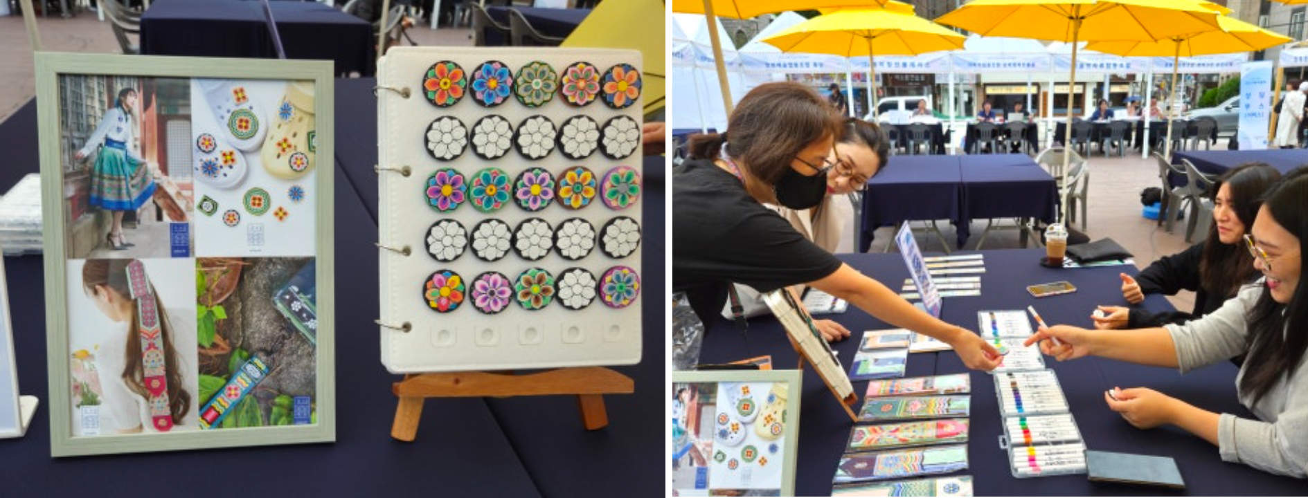 부스를 둘러보는 공무원들과 주민들로 행사장이 붐비는 가운데 체험 이벤트가 흥을 돋웠습니다. 성북구사회적경제센터 입주 기업 채문사에서 진행하는 단청 슈즈참 체험에는 박람회 시작 무렵부터 꾸준히 사람이 모였습니다. 전통 단청 문양에 색을 입혀 슈즈참을 완성하는 프로그램으로 다들 몰입하는 모습이 인상적이었습니다. 색을 입힐수록 문양이 살아나는 재미 덕분에 체험 테이블은 행사가 끝날 때까지 끊이지 않고 북적였답니다.