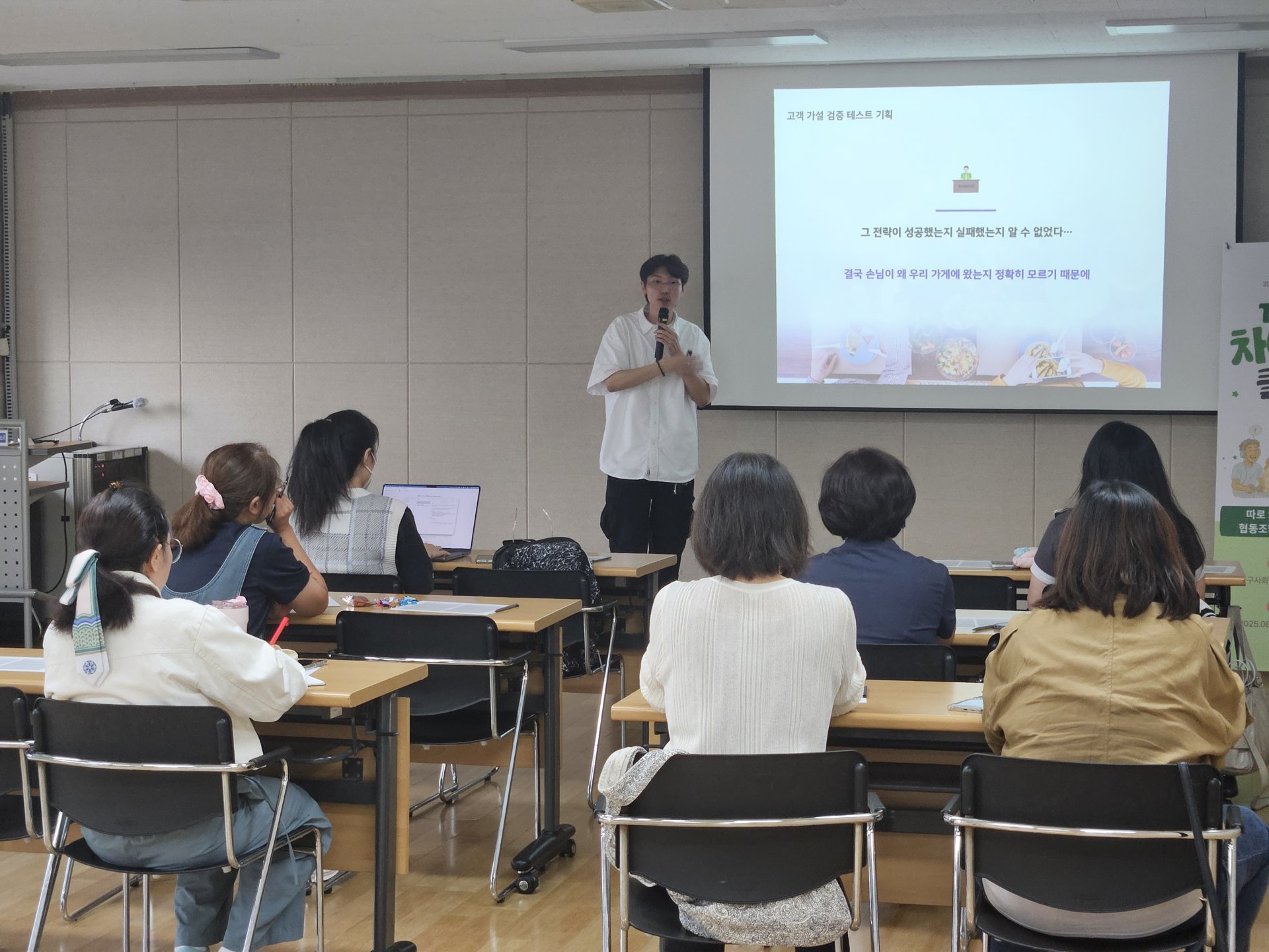 협동조합 마을학교 13강은 4강에서 인상적인 강의를 선보였던 (주)퍼센트 최승연 이사께서 사업 아이디어 검증에 대해 강의해 주셨습니다. 지난 번에 다뤘던 ‘고객의 문제를 발굴하는 법’에서 한 걸음 더 나아가 ‘내 사업 아이디어가 실제로 고객한테도 먹힐까?’를 구체적으로 검증하는 방법을 배웠습니다. 곧 열릴 2025 성북구 사회적경제 한마당 「모두의 향연」부스를 준비하고 운영하는데 실질적으로 필요한 내용들이었습니다.