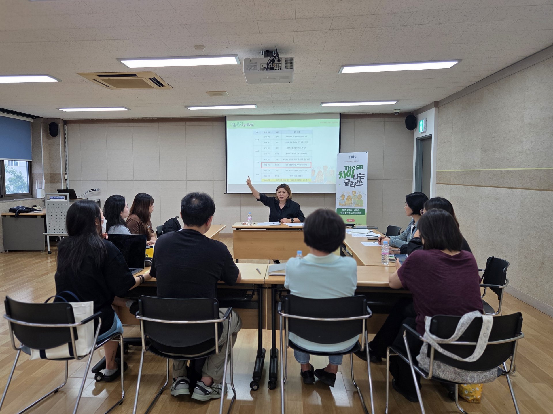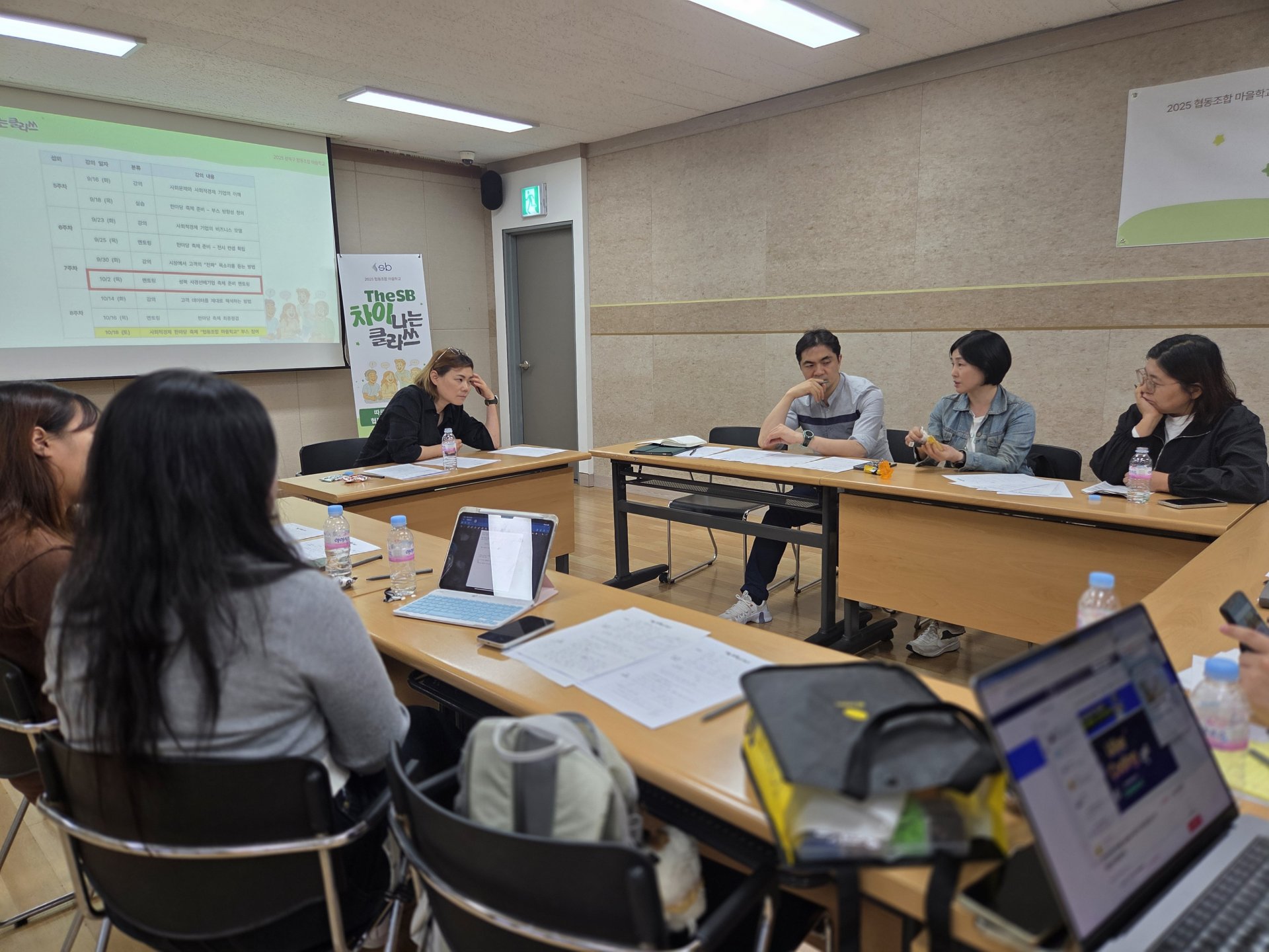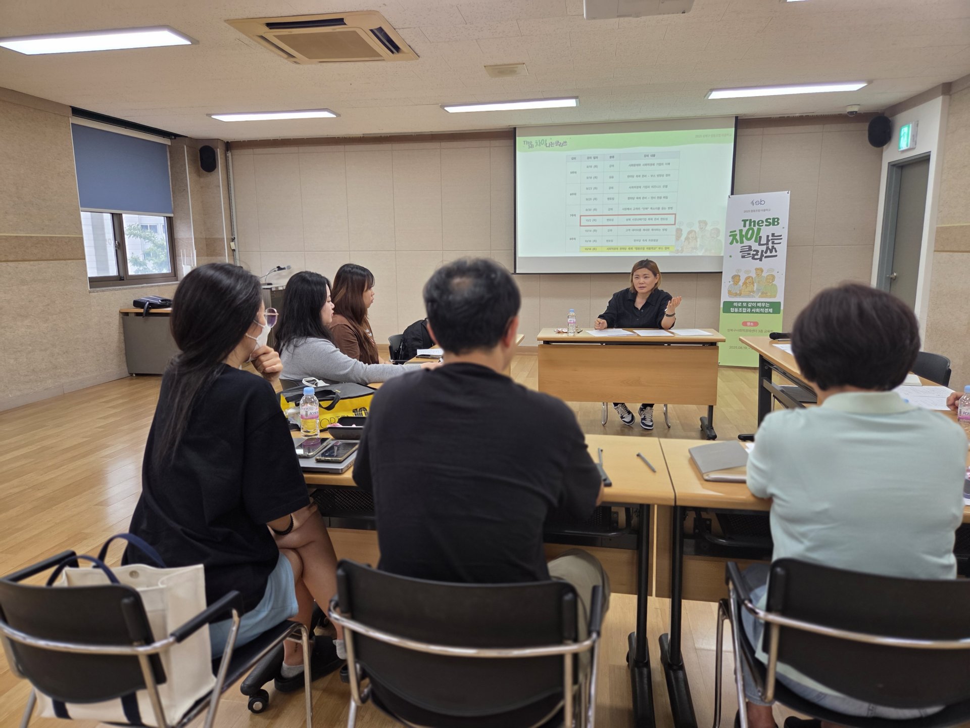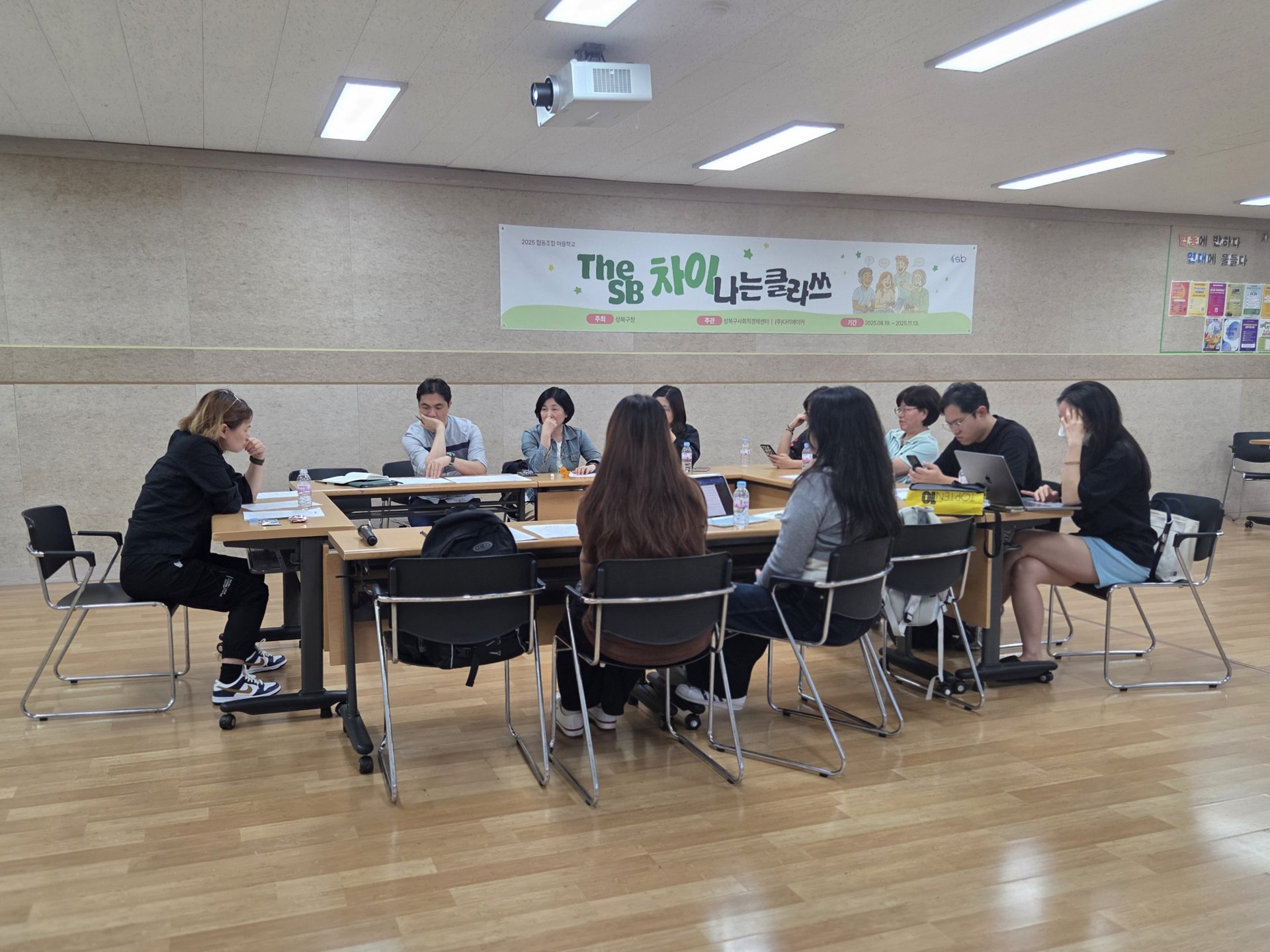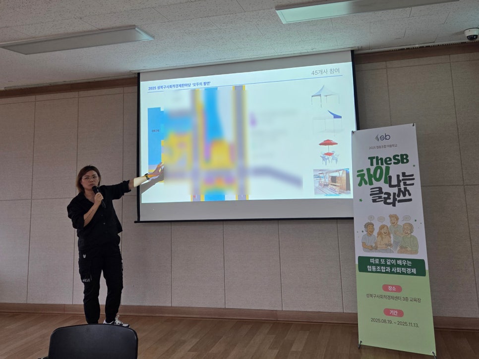 14강은 실전 감각을 한층 끌어올리는 부스 운영 멘토링 시간이었습니다. 성북구의 사회적경제 기업인 두비비협동조합의 이은숙 대표님이 멘토로 함께 했는데요. 이 대표님은 여러 지역의 대형 축제와 행사의 홍보 및 기획을 수행하고 있는 축제 디렉터입니다. 특히 올해 성북구 사회적경제 한마당 「모두의 향연」의 운영사이기도 해서 협동조합 마을학교 참여자들에게는 현장 실무를 바로 들을 수 있는 기회였죠. 이은숙 대표는 먼저 2025 「모두의 향연」의 전반적인 운영 방식을 간단히 소개했습니다.