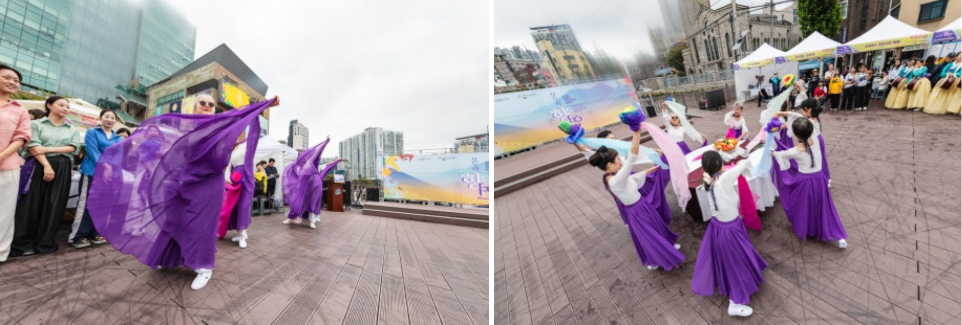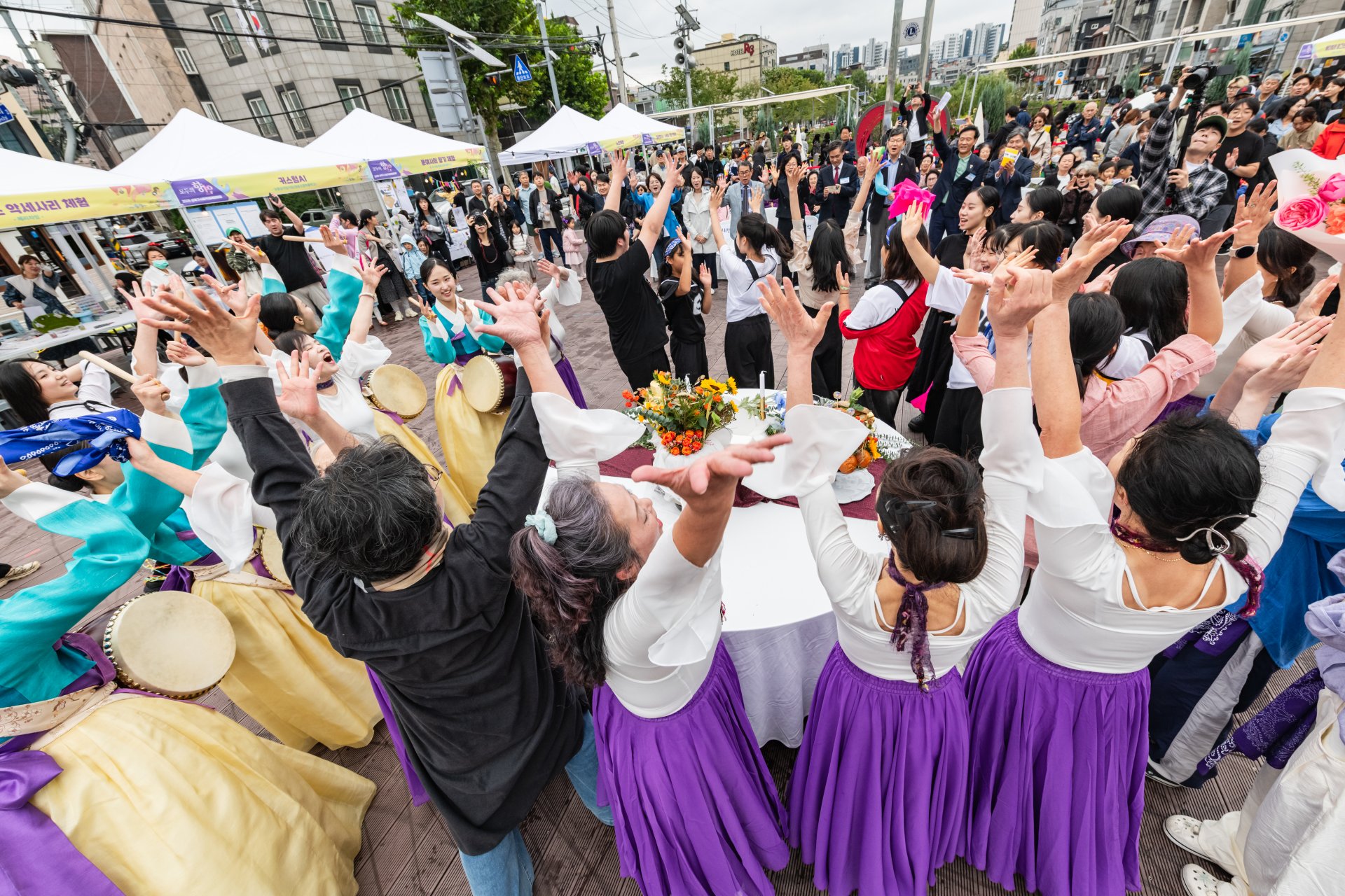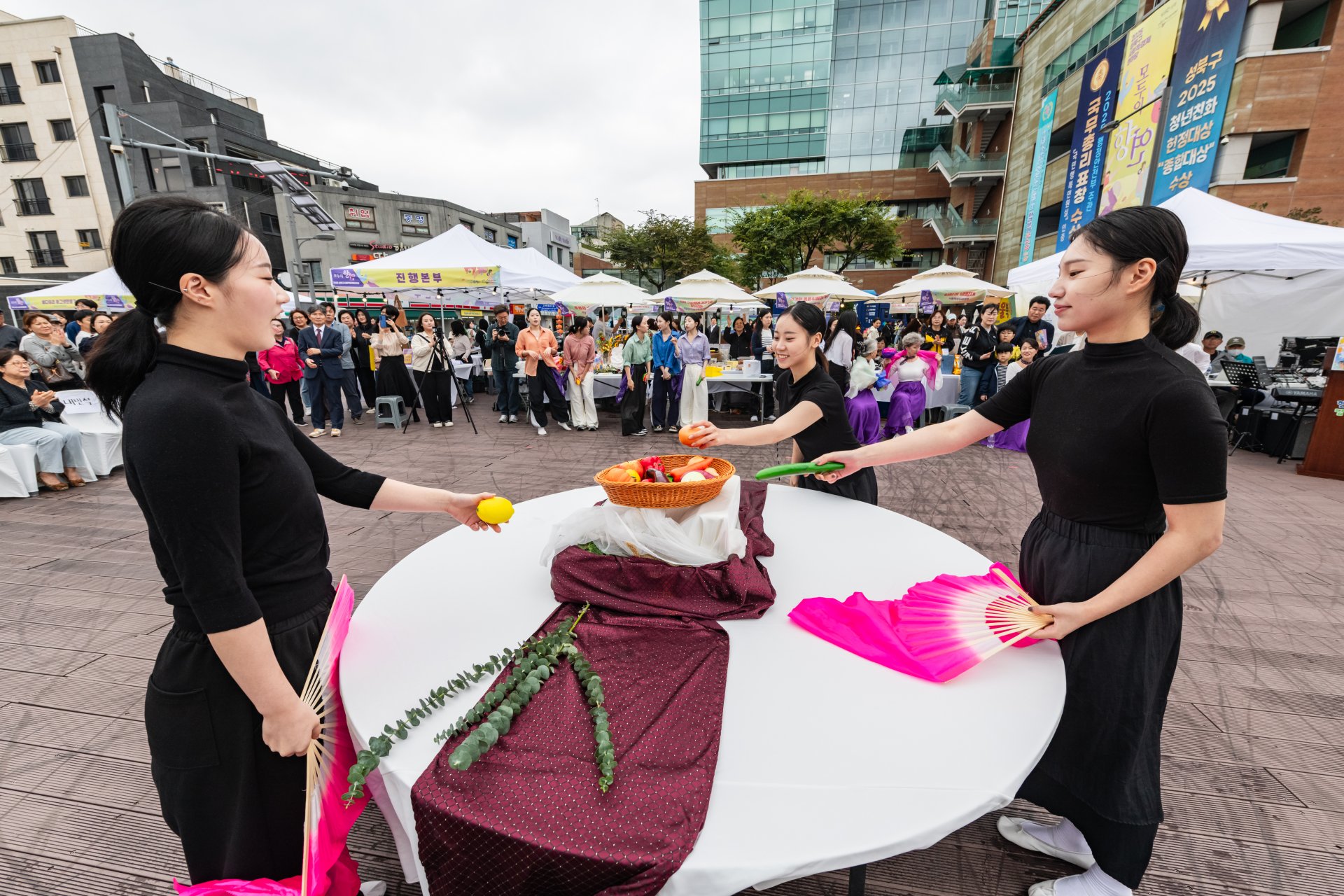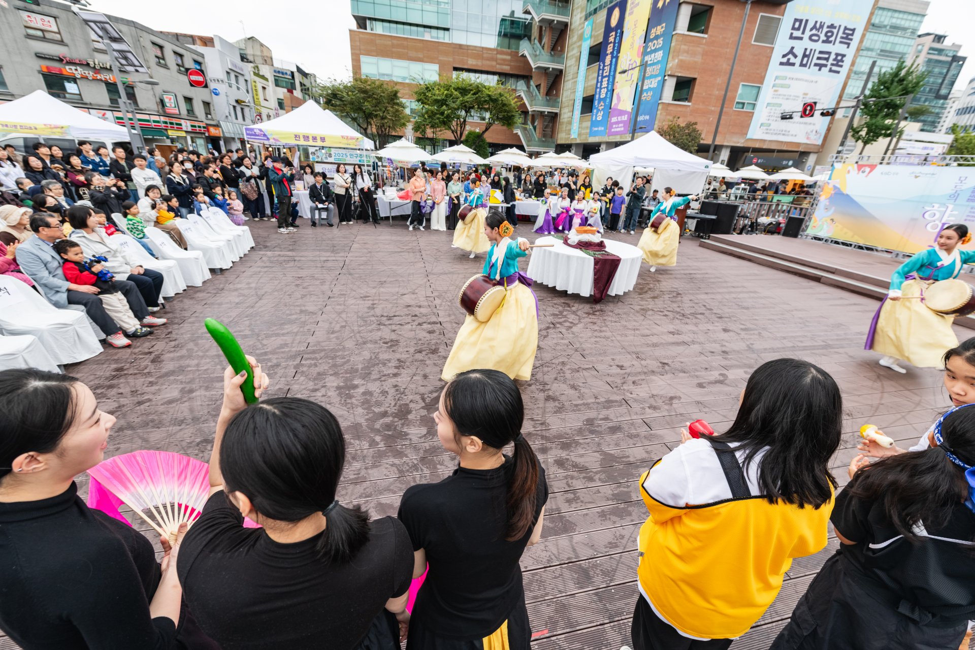 메인 테이블에 바구니가 놓인 후 본격적인 공연이 시작되었습니다. 멋들어진 북춤이 둥둥 심장을 울리며 지나가는 시민들의 발길을 붙잡았습니다.
