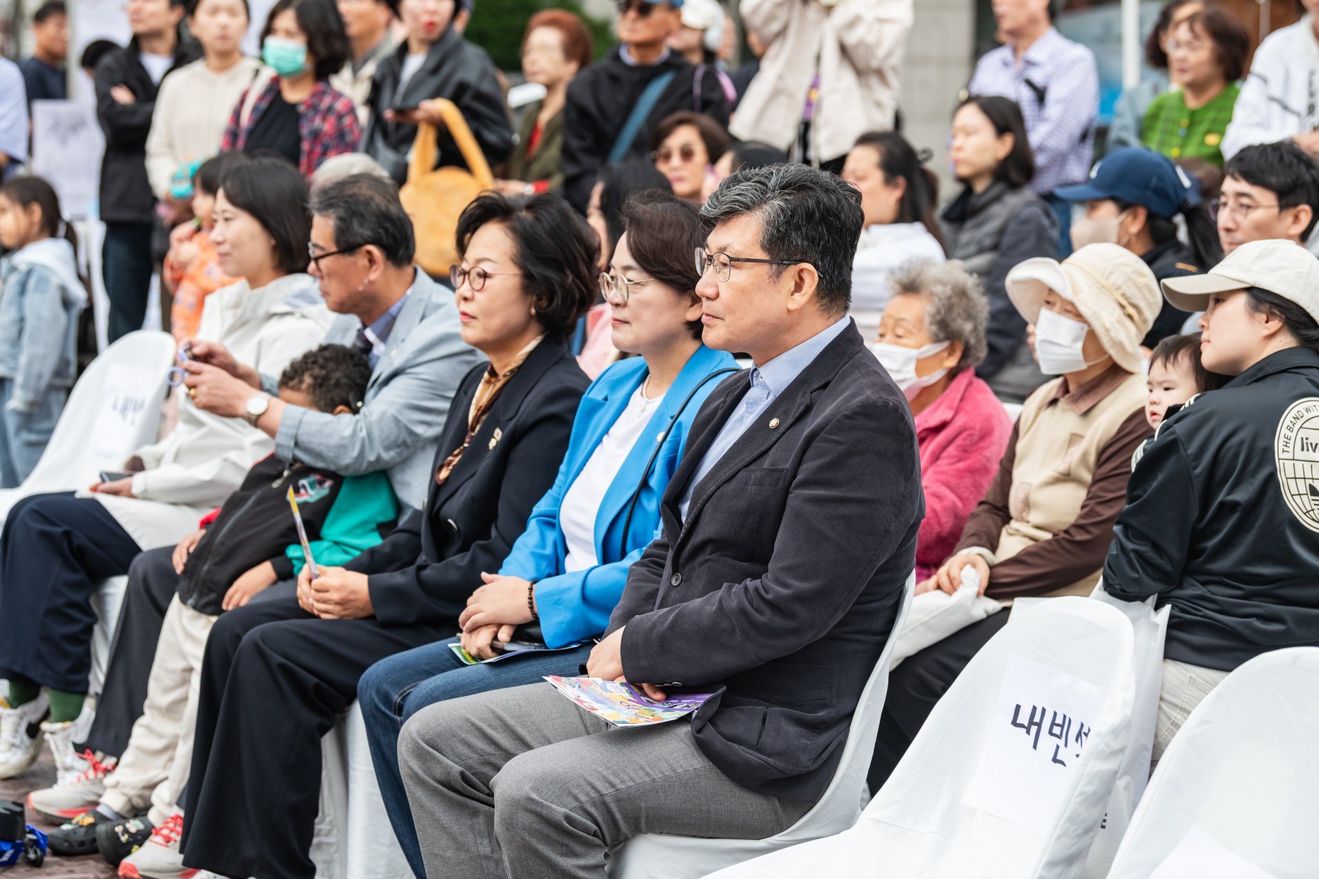 ‘여는 무대’는 공연단의 길놀이로 시작되었습니다. 「2025 모두의 향연」이 열린 성북구청 바람마당에는 개막식 이전부터 주민들이 모여들었는데요. 행사장 곳곳을 차례로 지나는 동안 공연단은 주민들과 눈을 맞추고 부스 운영진과 하이파이브를 하며 바람마당 중앙에 다다랐습니다. 공연단은 마당을 돌며 한층 흥을 돋웠는데요. 청소년과 대학생, 그리고 시니어까지 주민과 예술가가 모인 공연단 그 자체로도 눈길을 끌기에 충분했습니다. 동덕여대 윤혜선 교수가 이끄는 ‘그린하모니아트 공연단’·성북 우리마을 청소년 네트워크 ‘BOYC-OTT(보이콧) 아리아팀’·시니어 ‘지구미인 팀’ 등 총 30명의 여는 무대 공연단이 다채로운 모습으로 기대감을 키웠습니다.