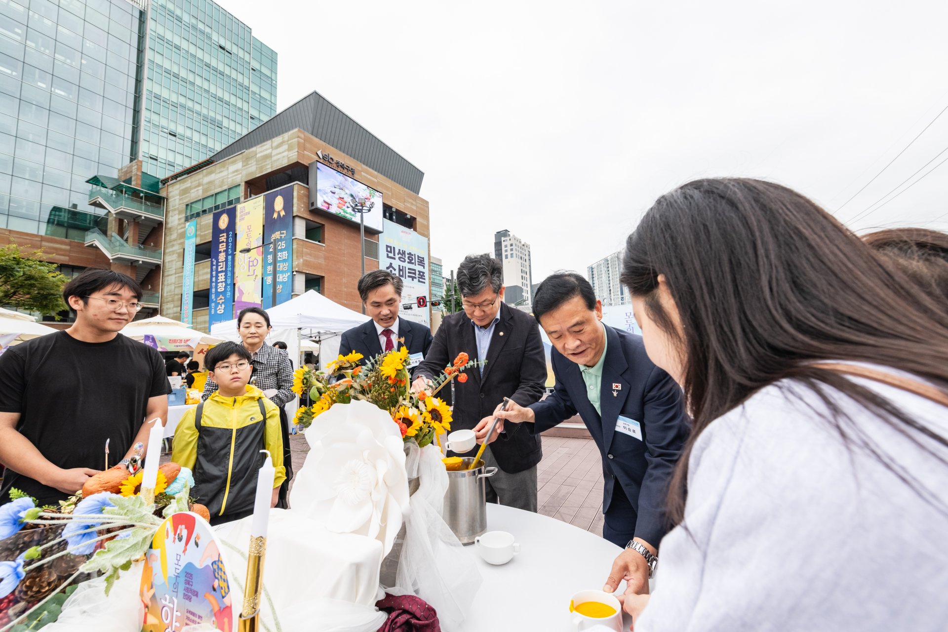 그러는 동안 메인 테이블에는 진짜 수프가 놓였습니다. 성북구 사회적경제 먹거리 기업에서 준비한 수프였습니다. 성북구청장님과 국회의원, 지역위원장께서 성북구의 사회적경제 기업 대표님들, 주민 대표 어르신과 어린이에게 직접 수프를 나눔하며 「2025 모두의 향연」 개회를 알렸습니다.