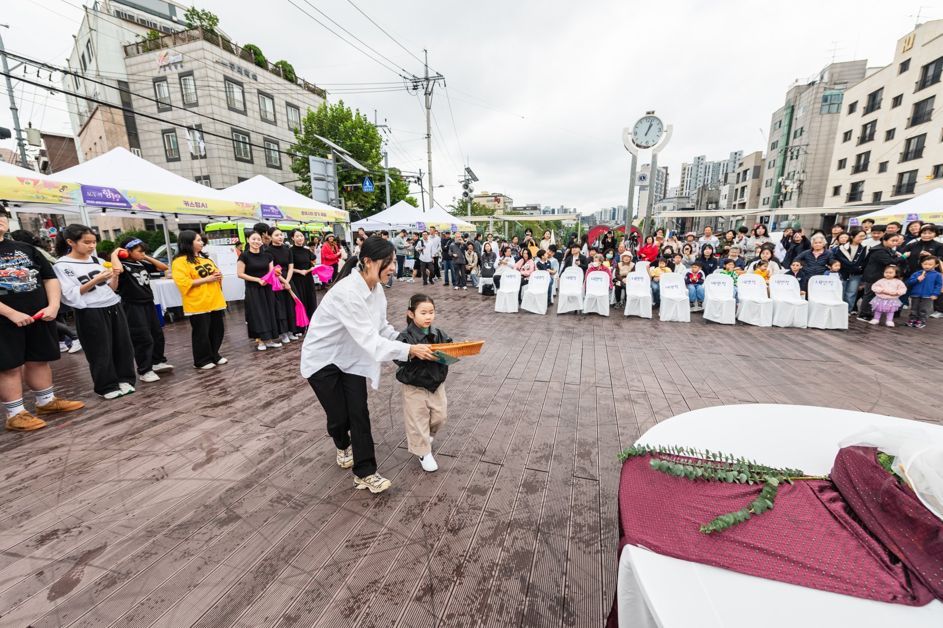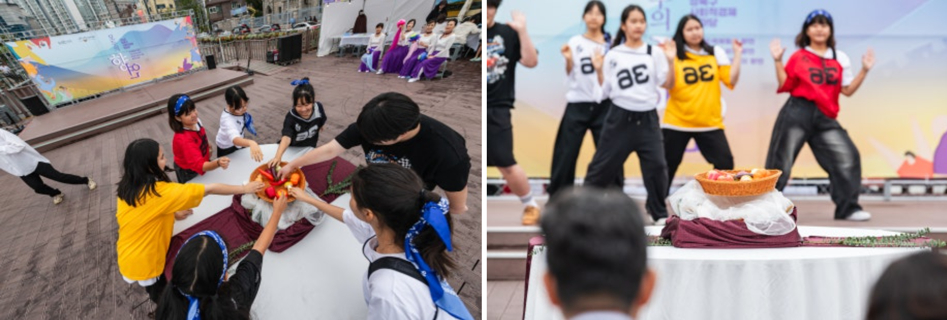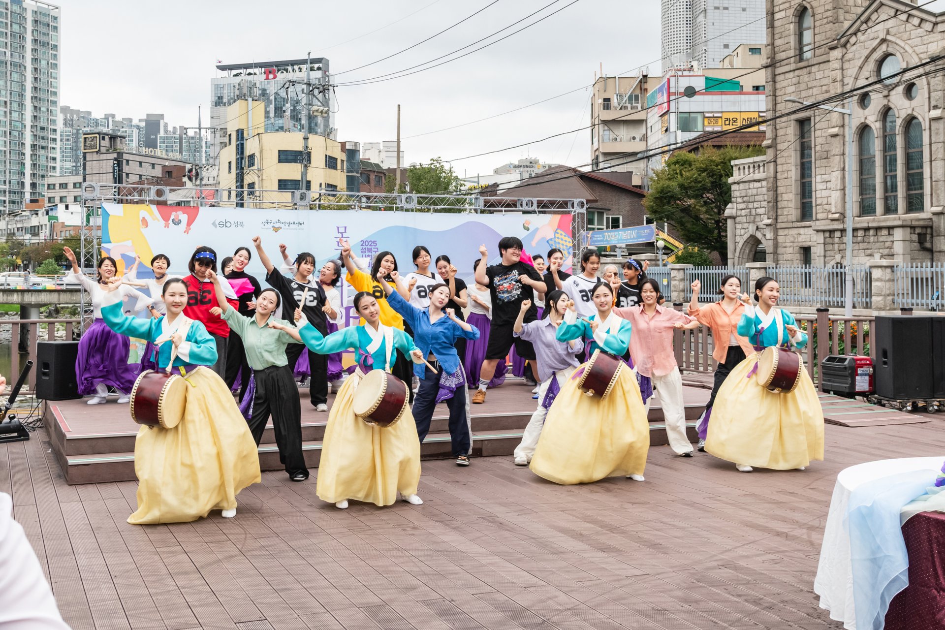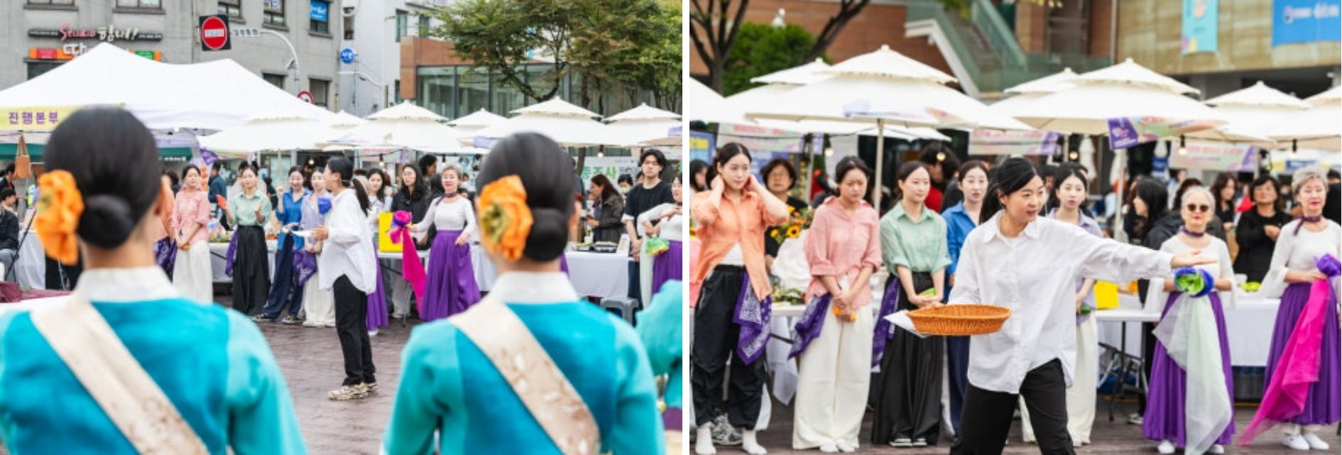 메인 테이블에 바구니가 놓인 후 본격적인 공연이 시작되었습니다. 멋들어진 북춤이 둥둥 심장을 울리며 지나가는 시민들의 발길을 붙잡았습니다.