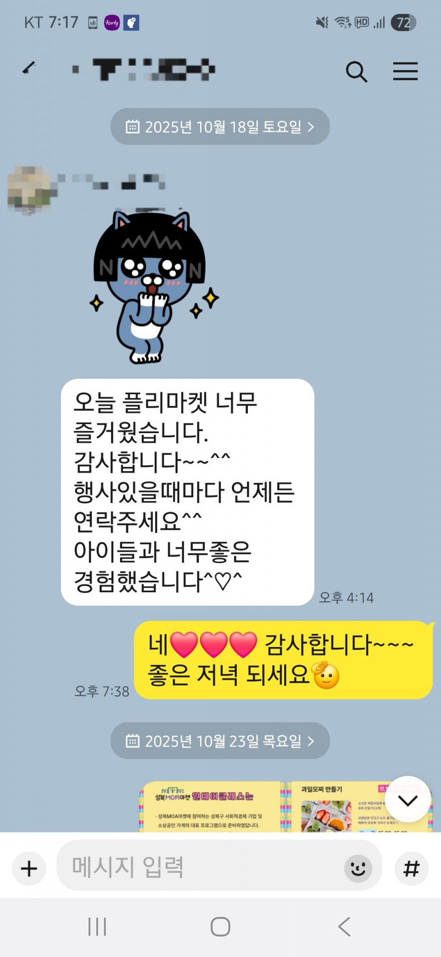 어린이 플리마켓에 참여했던 어떤 주민분은 저희에게 이런 카톡을 남겨 주시기도 하였습니다.