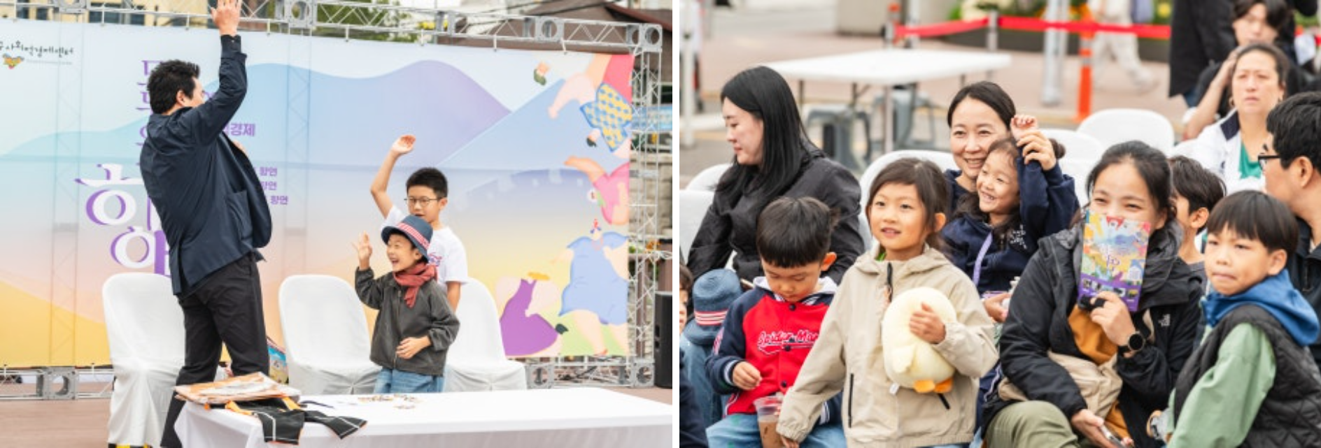 사회자의 유쾌한 진행 속에 관객석에서는 박수와 환호가 그치지 않았습니다. 낙찰받은 분께는 기념품도 증정되었는데요. 다들 신나는 모습이었습니다. 물건을 내놓은 어린이를 비롯해 경매쇼에 참여한 분들 모두 즐겁고 의미 있는 시간을 보냈답니다.