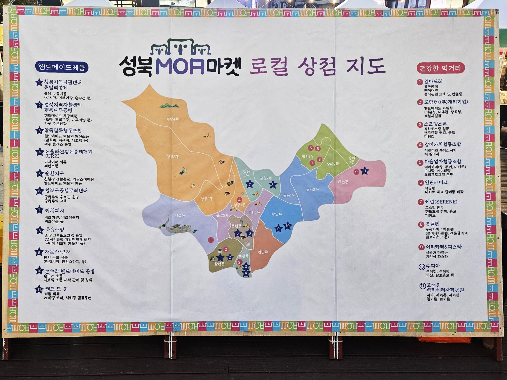 성북MOA마켓은 골목상권 활성화를 위해 성북구 사회적경제 기업과 소상공인이 함께 준비한 로컬 상생마켓입니다. 로컬답게, 성북구 장인들의 수공예품과 패브릭 제품 및 건강한 재료로 만든 먹거리가 가득했습니다. 지역 디자이너 의류·친환경 생활재·공정무역 제품도 선보였습니다. 22개의 부스에 다채로운 상품들이 주민분의 눈길과 발길을 붙잡았습니다.