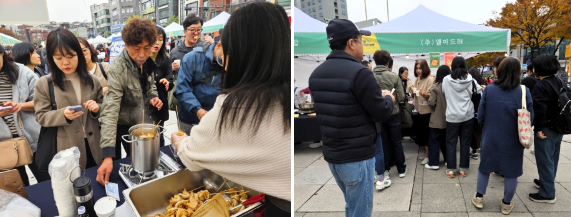 성북MOA마켓이 열린 11월 8일, 분수마루는 이른 오전 시간부터 분주했습니다. 부스 테이블마다 판매할 물품이 전시되고 가격표가 놓였습니다. 먹거리를 판매하는 부스에서는 재료 준비가 한창이었고요. 미리 끓여 놔야 하는 떡볶이와 어묵, 막 굽기 시작한 소시지가 맛있는 냄새를 풍겼습니다.