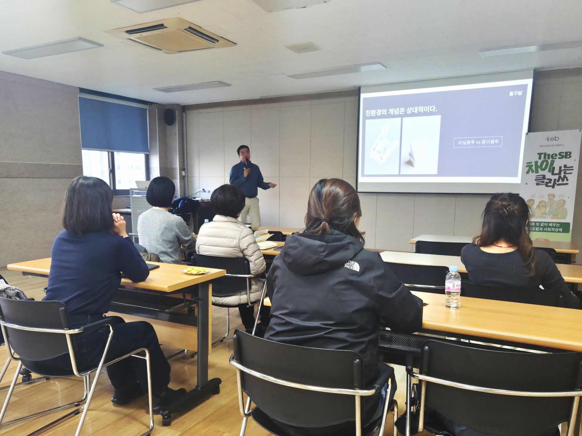 11.04.(화)에는 기초가 되는 사업계획서의 핵심 구조에 대해 배웠습니다. 강의를 맡은 (주)그리닝 김기현 대표는 ‘문제 정의→타깃 분석→비즈니스 모델→사회적 가치’에 이르는 사업계획서의 핵심 구조를 사례를 통해 설명했습니다.