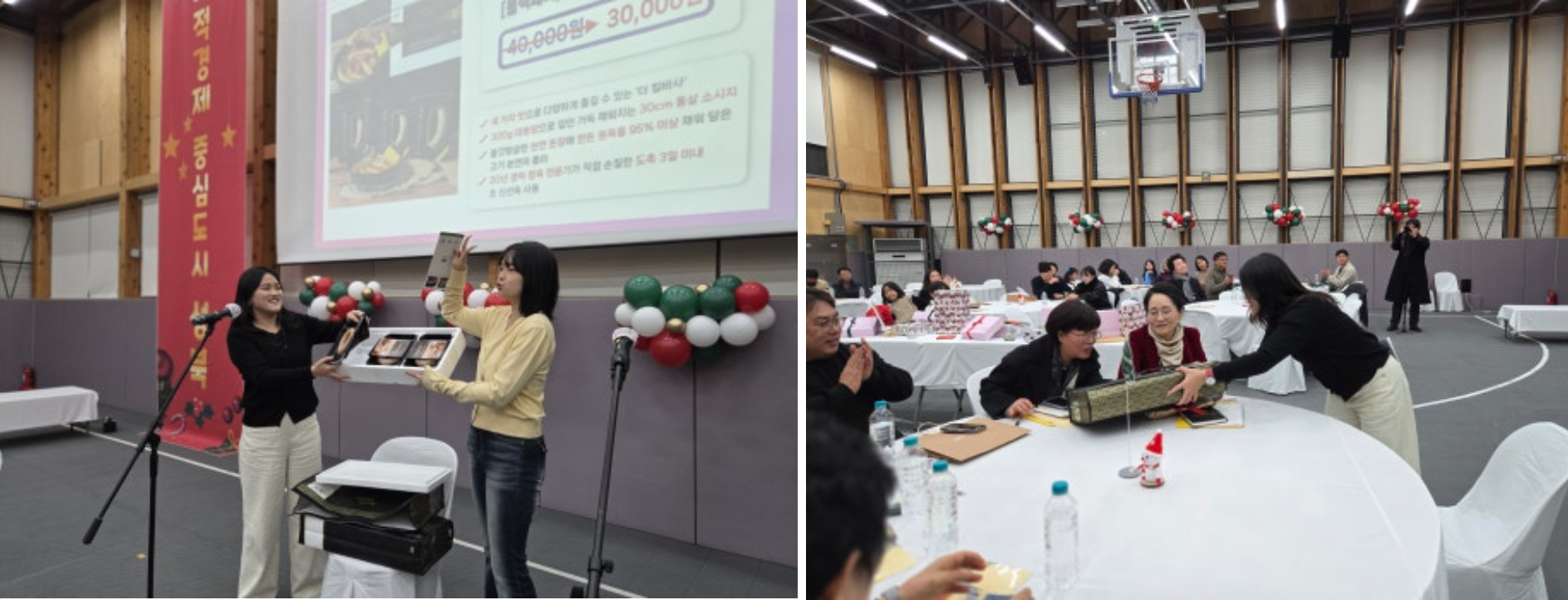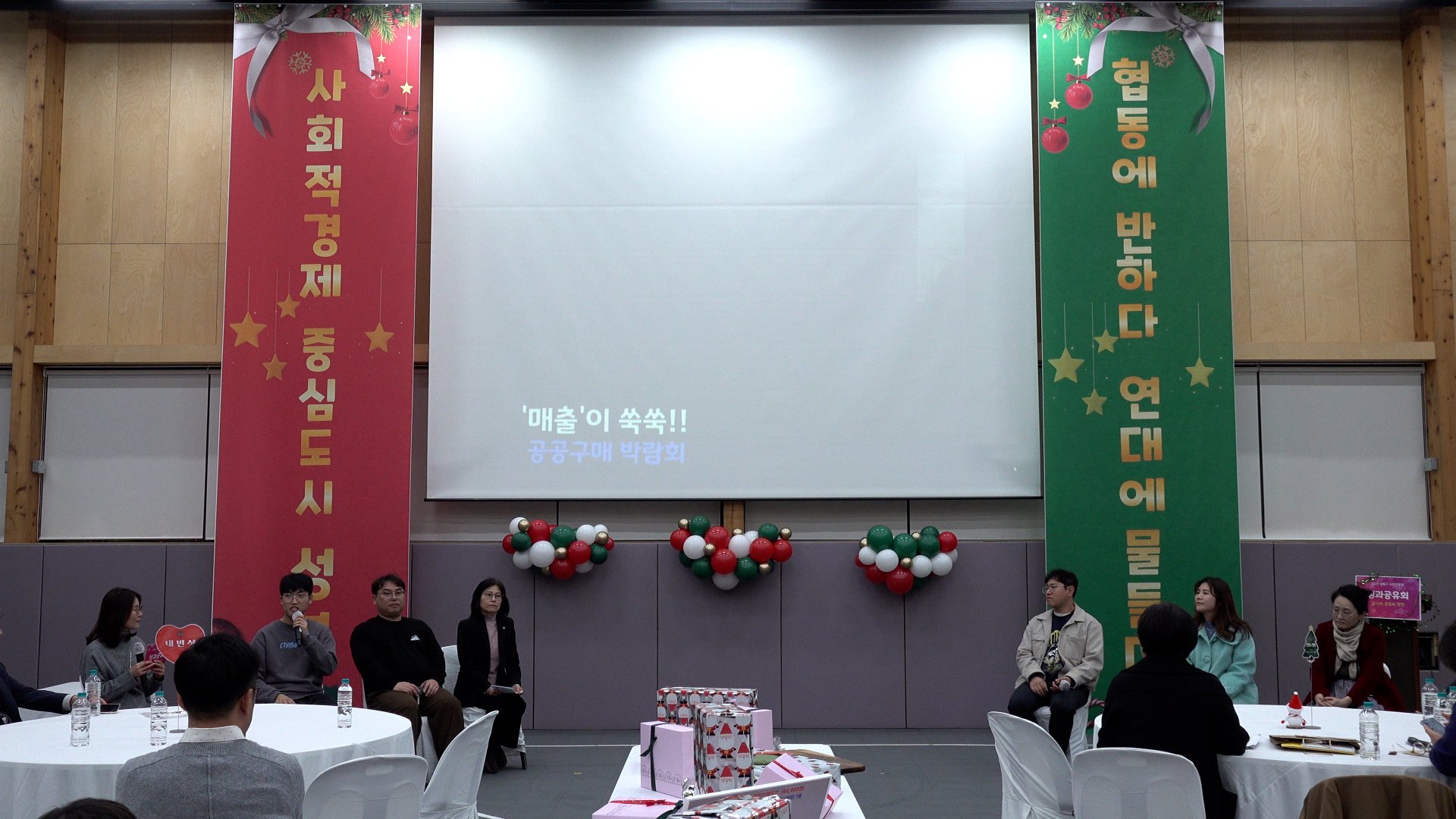 2부를 준비하는 동안 인터미션에는 ‘성사경 라이브 with 따겨’가 진행되었습니다. ‘성사경 라이브’를 진행하는 쇼호스트가 지역 사회적경제 기업의 제품을 현장에서 소개하고 판매하였습니다. 판매액은 전액 2026 따뜻한 겨울나기 성금으로 기부되었습니다. 물품을 후원해 주신 알록달록협동조합, 같이가치협동조합에 감사의 말씀을 드립니다.