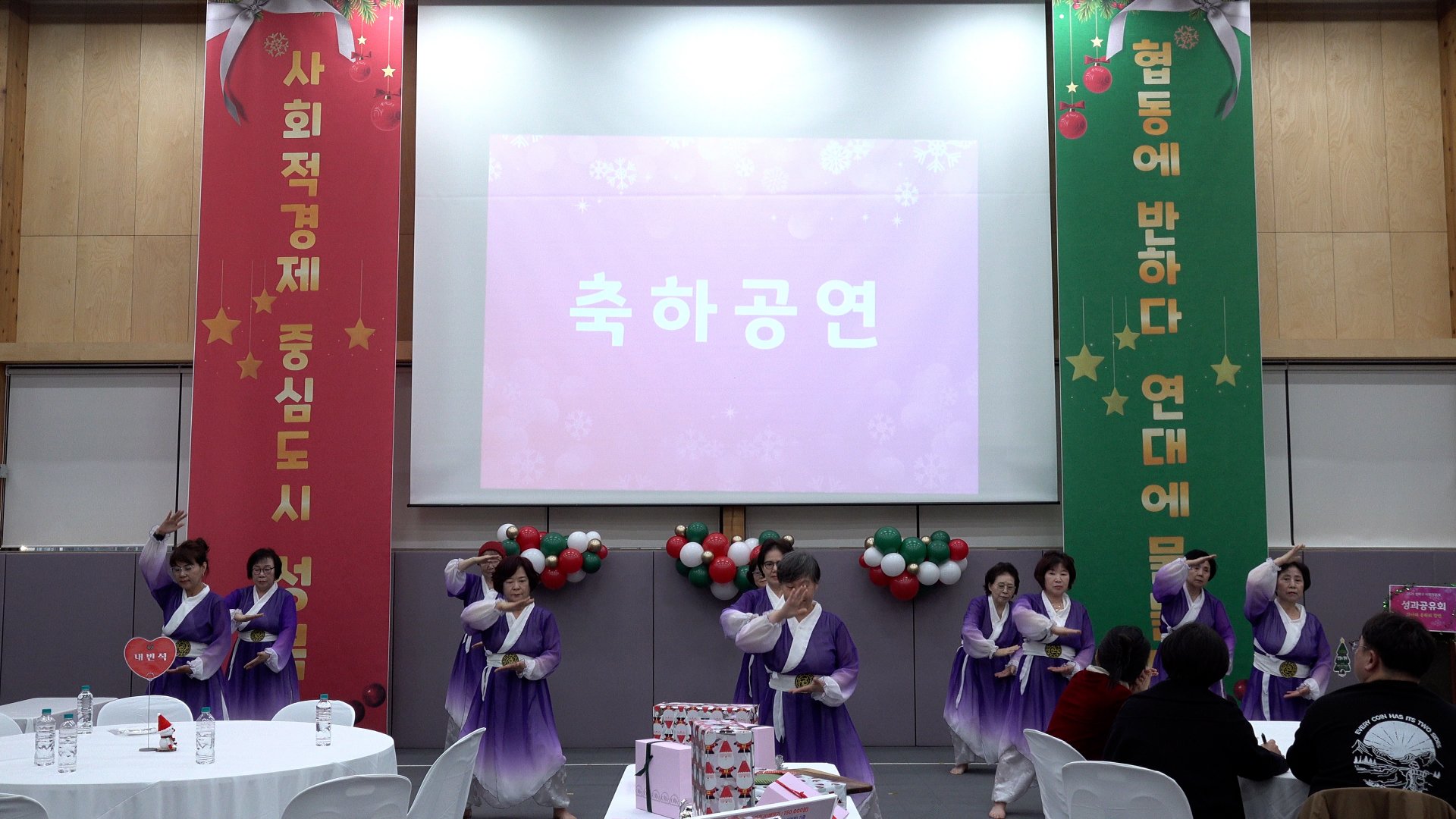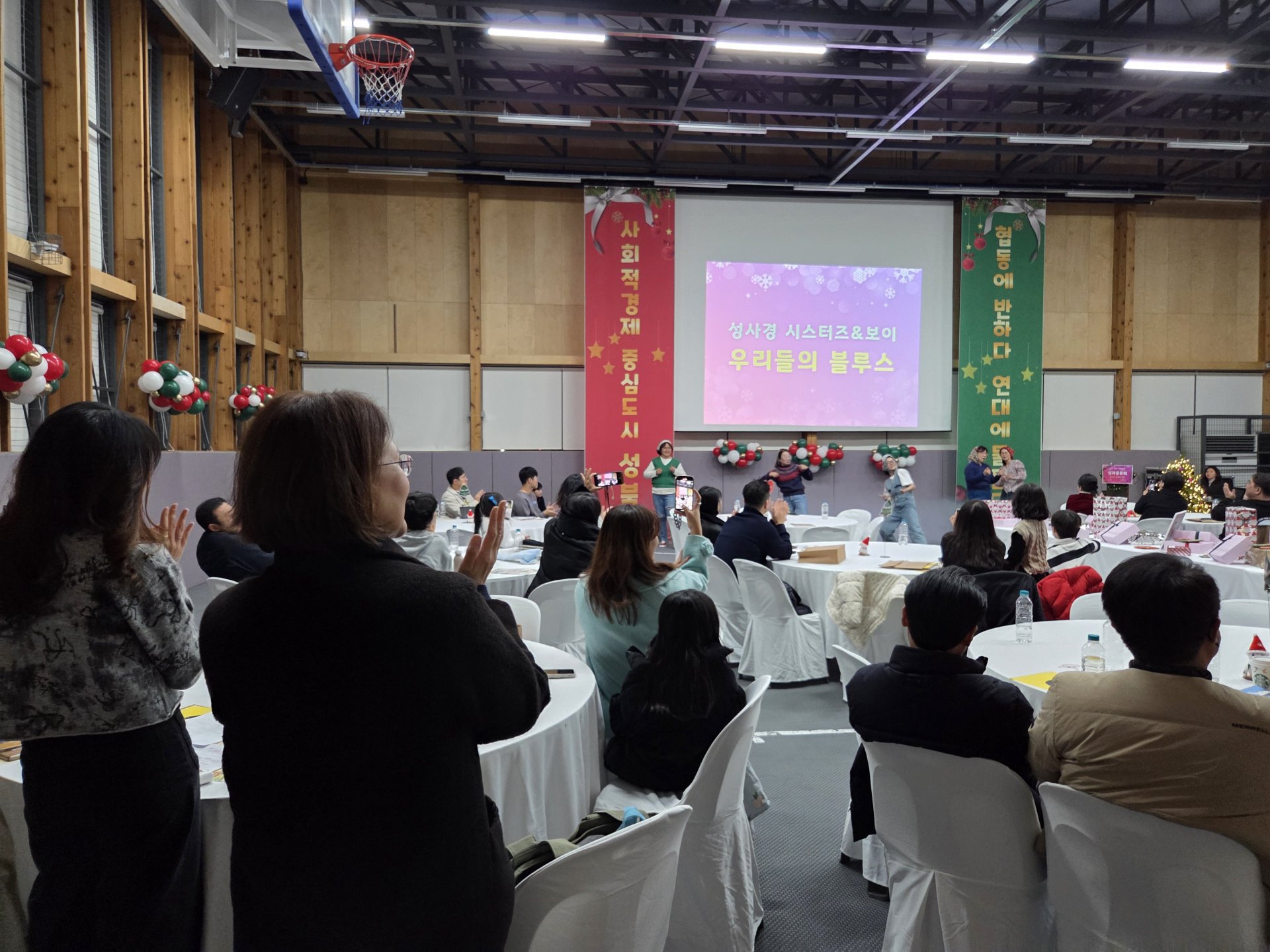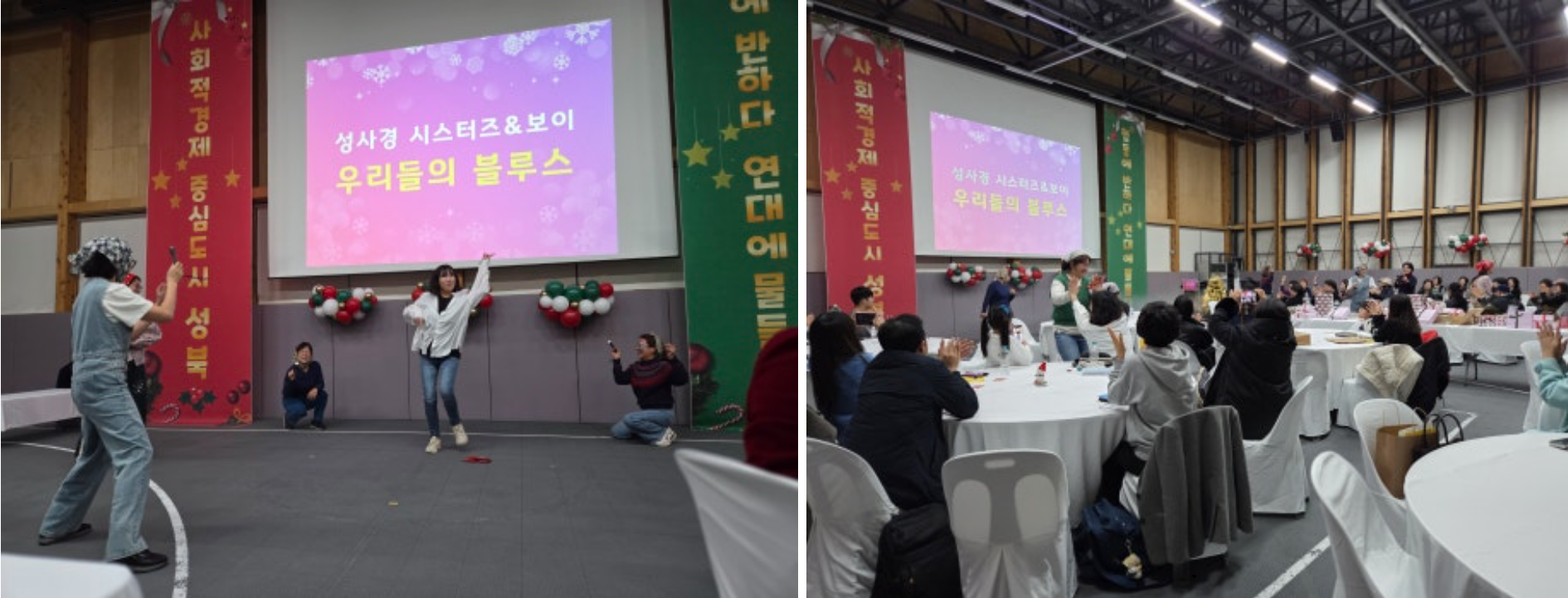 올 한 해 사회적경제 현장에서 애써 온 서로를 응원하기 위해 성사경 시스터즈&보이가 노래와 퍼포먼스를 결합한 멋진 무대를 선보였습니다. 네레이션에 이어 댄스가 어우러진 공연이 한 해의 수고를 유쾌하게 풀어내며 공감을 얻었습니다. 예상을 뛰어넘는 에너지 넘치는 무대에 객석에서는 웃음과 박수가 이어지며 현장을 후끈 달궜습니다.