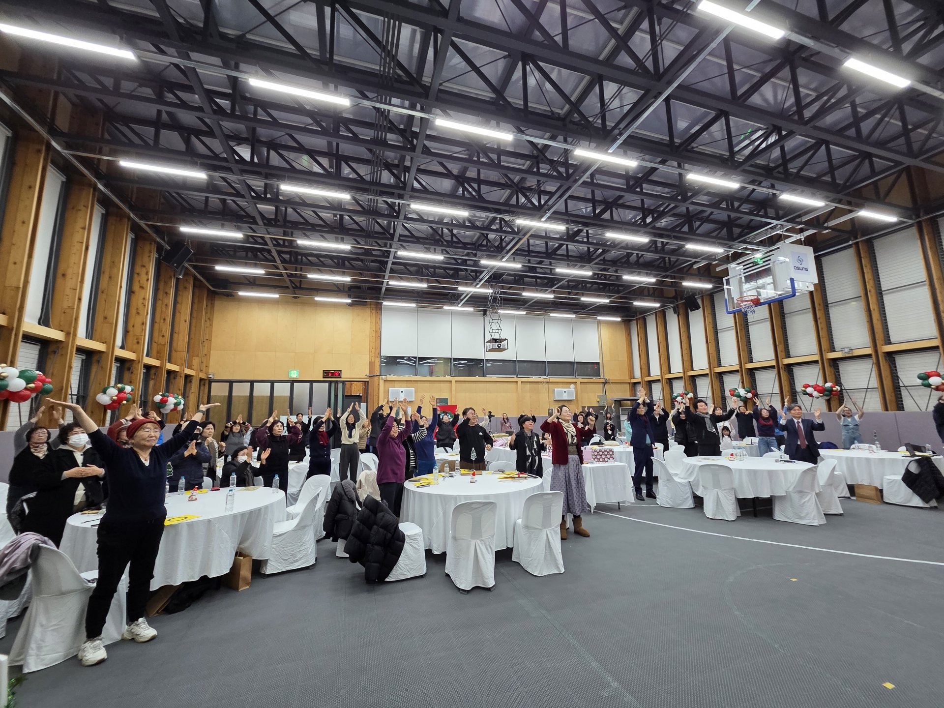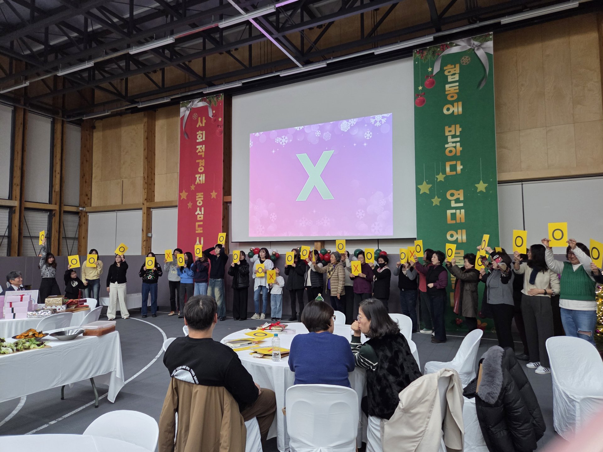 신나는 댄스에 이어 (주)다리메이커에서 준비한 참여형 레크레이션이 이어졌습니다. 간단한 몸풀기 체조를 시작으로 OX퀴즈와 ‘성사경 미래뉘우스’ 투표가 진행되며 자연스럽게 웃음과 이야기가 오갔습니다.