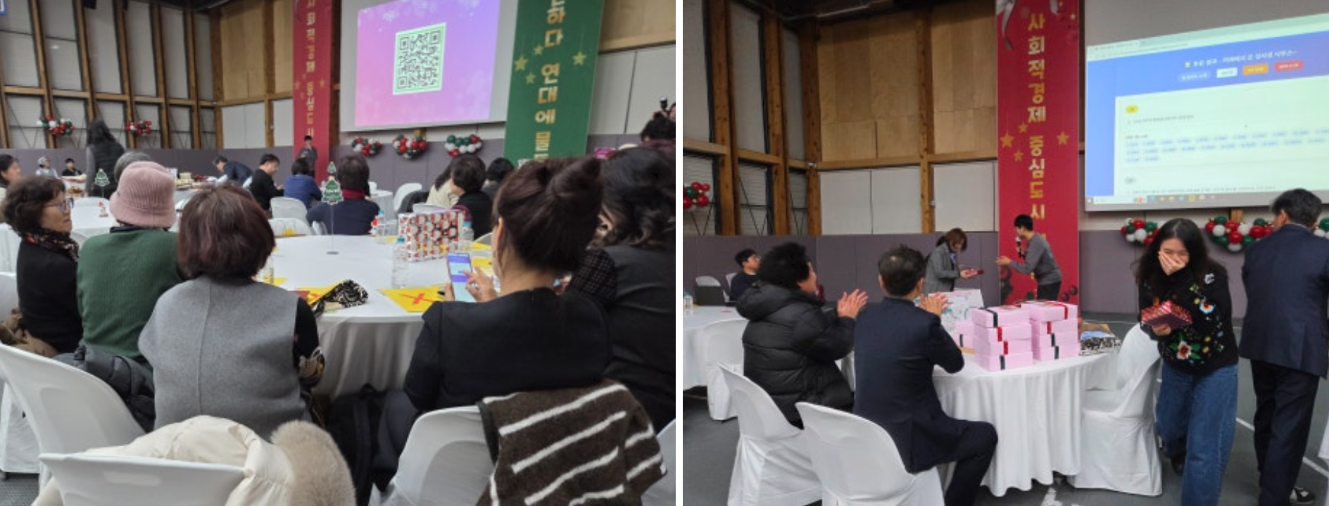 마지막으로 다 함께 크리스마스를 보내는 모습을 콘셉트로 한 포토 이벤트를 소개하며 2025 성과공유회 현장스케치를 마치고자 합니다. 입장하며 포토존에서 촬영하도록 안내드렸는데 처음엔 조금 쑥스러워하시던 분들도 이내 자연스럽게 포즈를 취해 주셨습니다. 각자의 사진이 모여 만들어 낸 연말 분위기 즐감하세요.